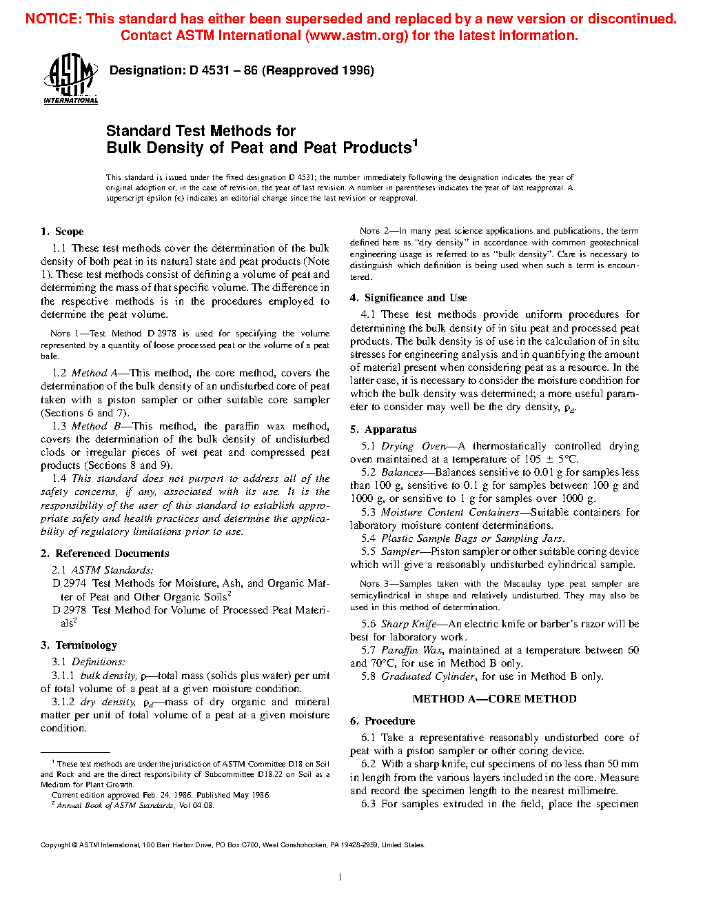 1.2 Method A—The core method covers the determination of the bulk density of a core of peat taken with a piston sampler or other suitable core sampler (Sections 6 and 7).