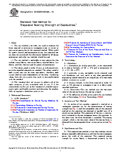 1.1 This test method is an index test used to measure the force required to continue or propagate a tear in woven or nonwoven geotextiles by the trapezoid method. While useful for quality control and acceptance testing, the trapezoid tear test does not provide all the information needed for all design applications and other test methods should be used.