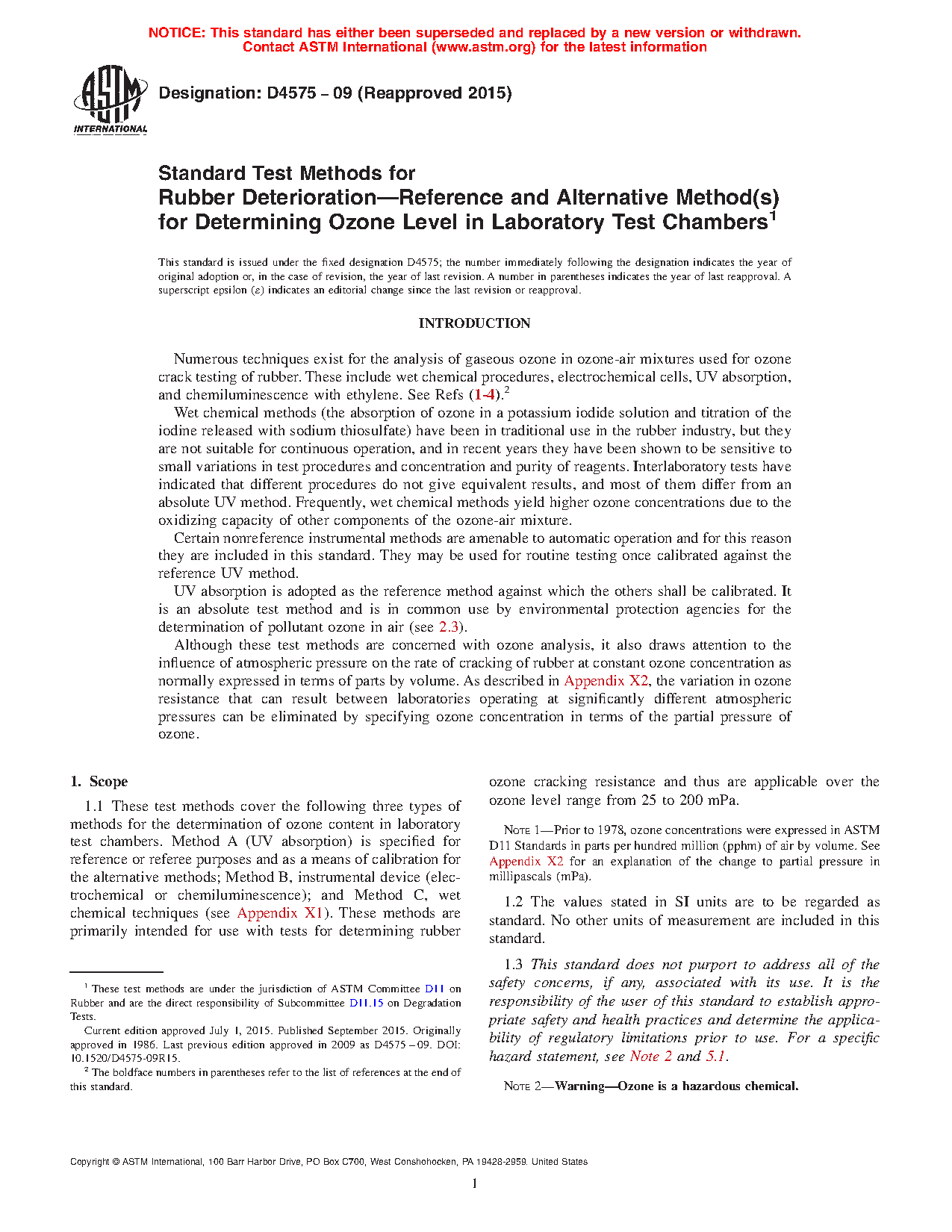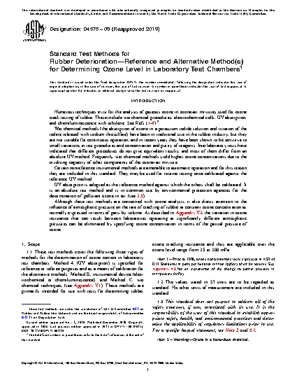 1.1 These test methods cover the following three types of methods for the determination of ozone content in laboratory test chambers. Method A (UV absorption) is specified for reference or referee purposes and as a means of calibration for the alternative methods; Method B, instrumental device (electrochemical or chemiluminescence); and Method C, wet chemical techniques (see Appendix X1). These methods are primarily intended for use with tests for determining rubber ozone cracking resistance and thus are applicable over the ozone level range from 25 to 200 mPa.