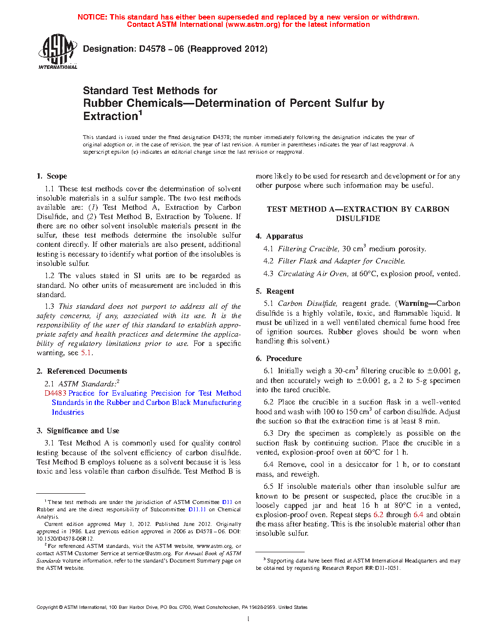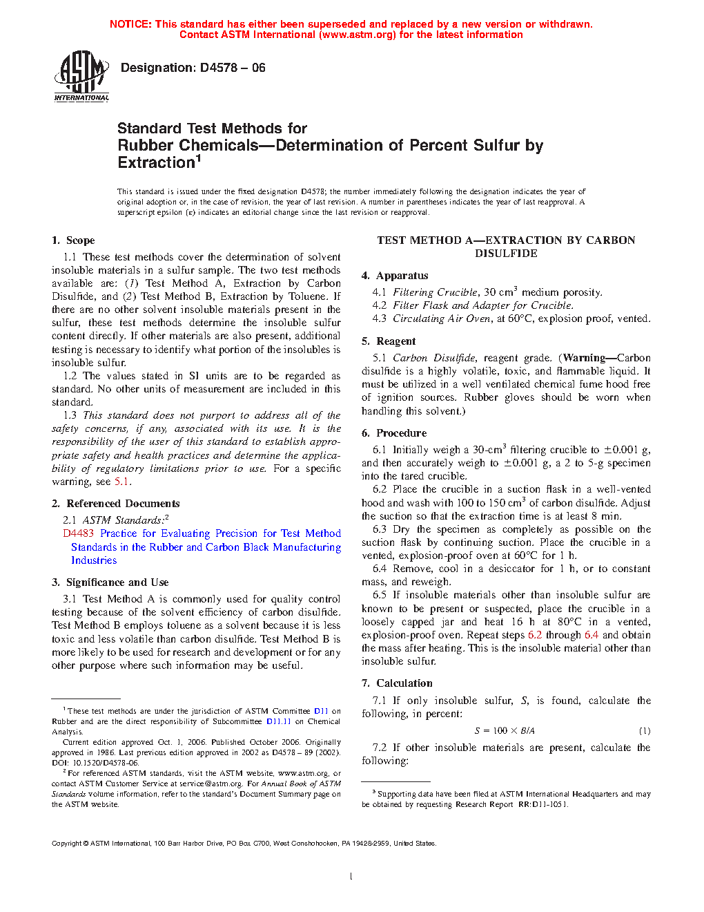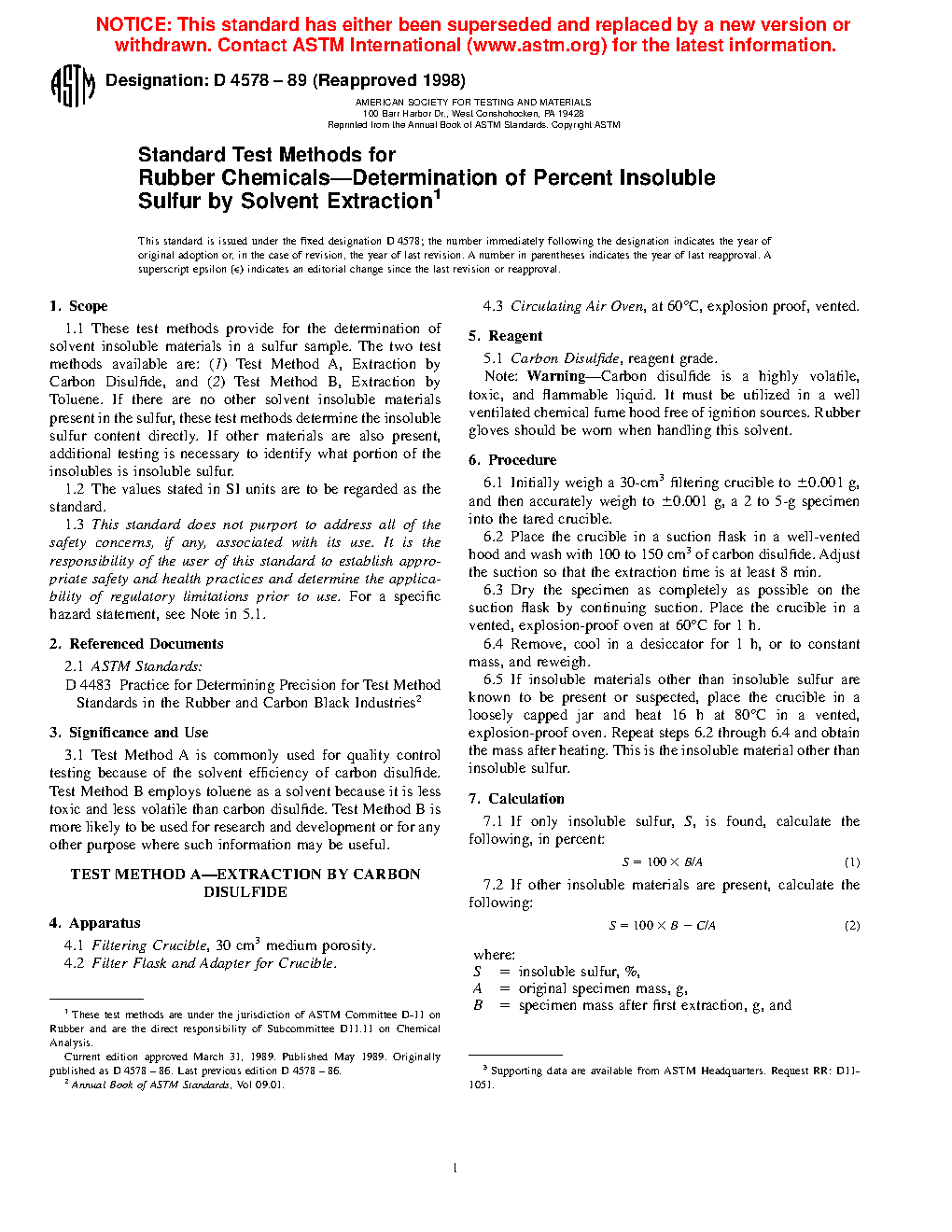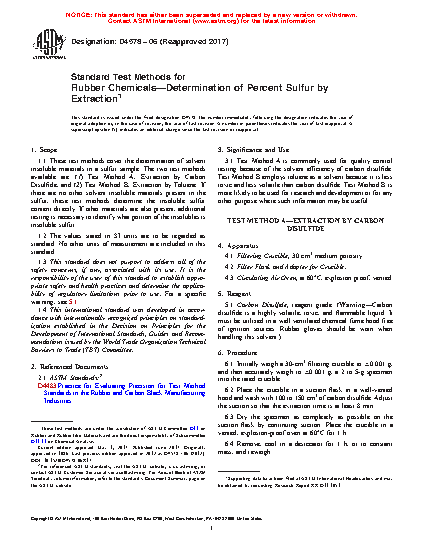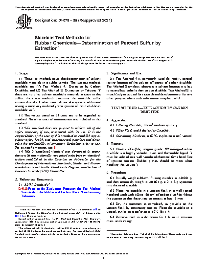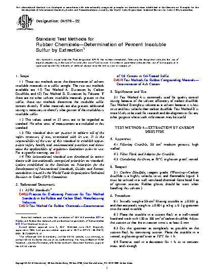 1.1 These test methods cover the determination of solvent insoluble materials in a sulfur sample. The two test methods available are: (1) Test Method A, Extraction by Carbon Disulfide, and (2) Test Method B, Extraction by Toluene. If there are no other solvent insoluble materials present in the sulfur, these test methods determine the insoluble sulfur content directly. If other materials are also present, additional testing is necessary to identify what portion of the insolubles is insoluble sulfur.