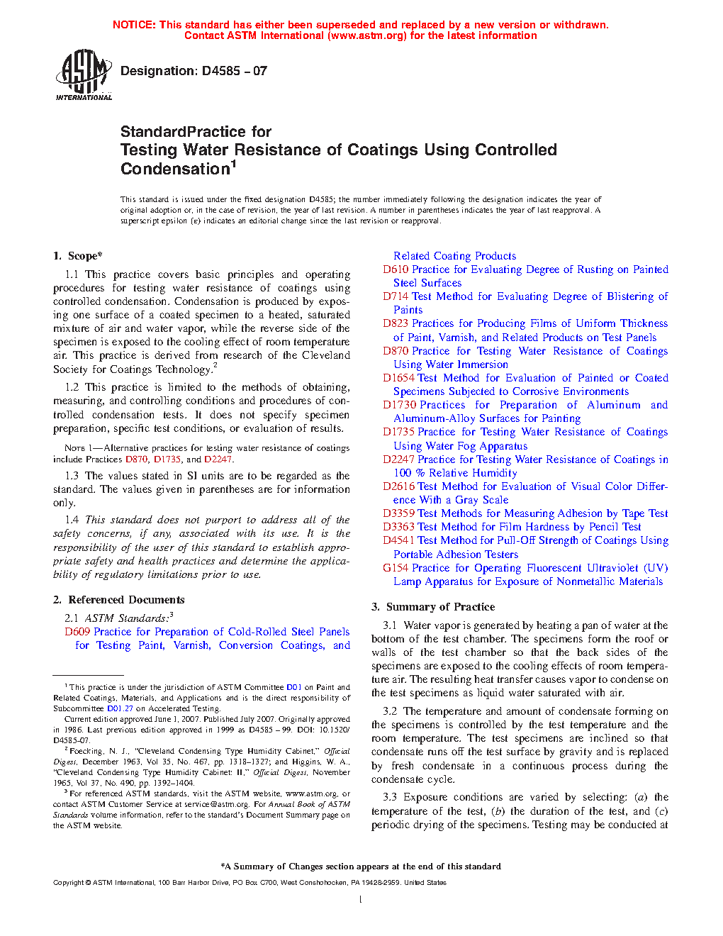 1.1 This practice covers basic principles and operating procedures for testing water resistance of coatings using controlled condensation. Condensation is produced by exposing one surface of a coated specimen to a heated, saturated mixture of air and water vapor, while the reverse side of the specimen is exposed to the cooling effect of room temperature air. This practice is derived from research of the Cleveland Society for Coatings Technology.