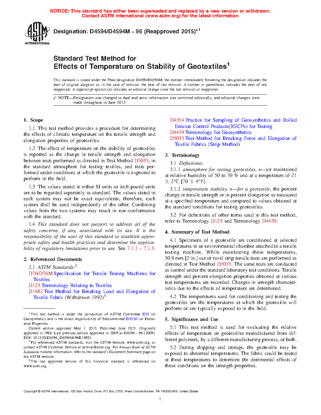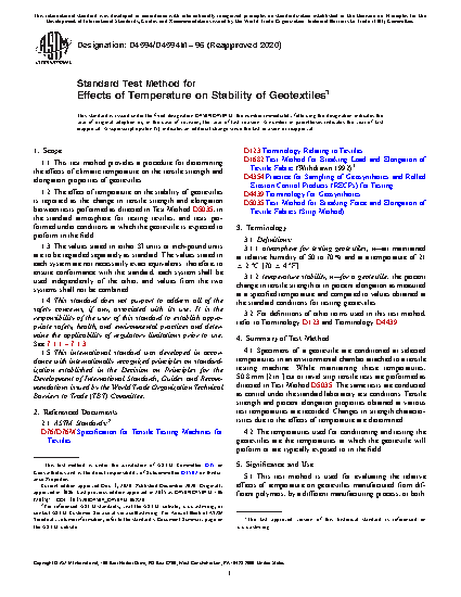 1.2 The effect of temperature on the stability of geotextiles is reported as the change in tensile strength and elongation between tests performed as directed in Test Method D5035, in the standard atmosphere for testing textiles, and tests performed under conditions at which the geotextile is expected to perform in the field.