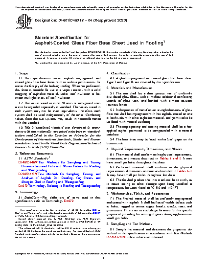 This specification covers the standards for asphalt impregnated and coated glass fiber base sheet intended for use as the first ply of built-up roofings. This sheets are also suitable for use as a vapor retarded under roof insulation or between multiple layers of roof insulation. The materials shall conform to the physical requirements, dimensions, and masses prescribed herein. The products shall not crack nor be too sticky as to cause damage upon being unrolled. The specimen shall also undergo testing to determine the following properties: breaking strength, moisture content, and pliability.