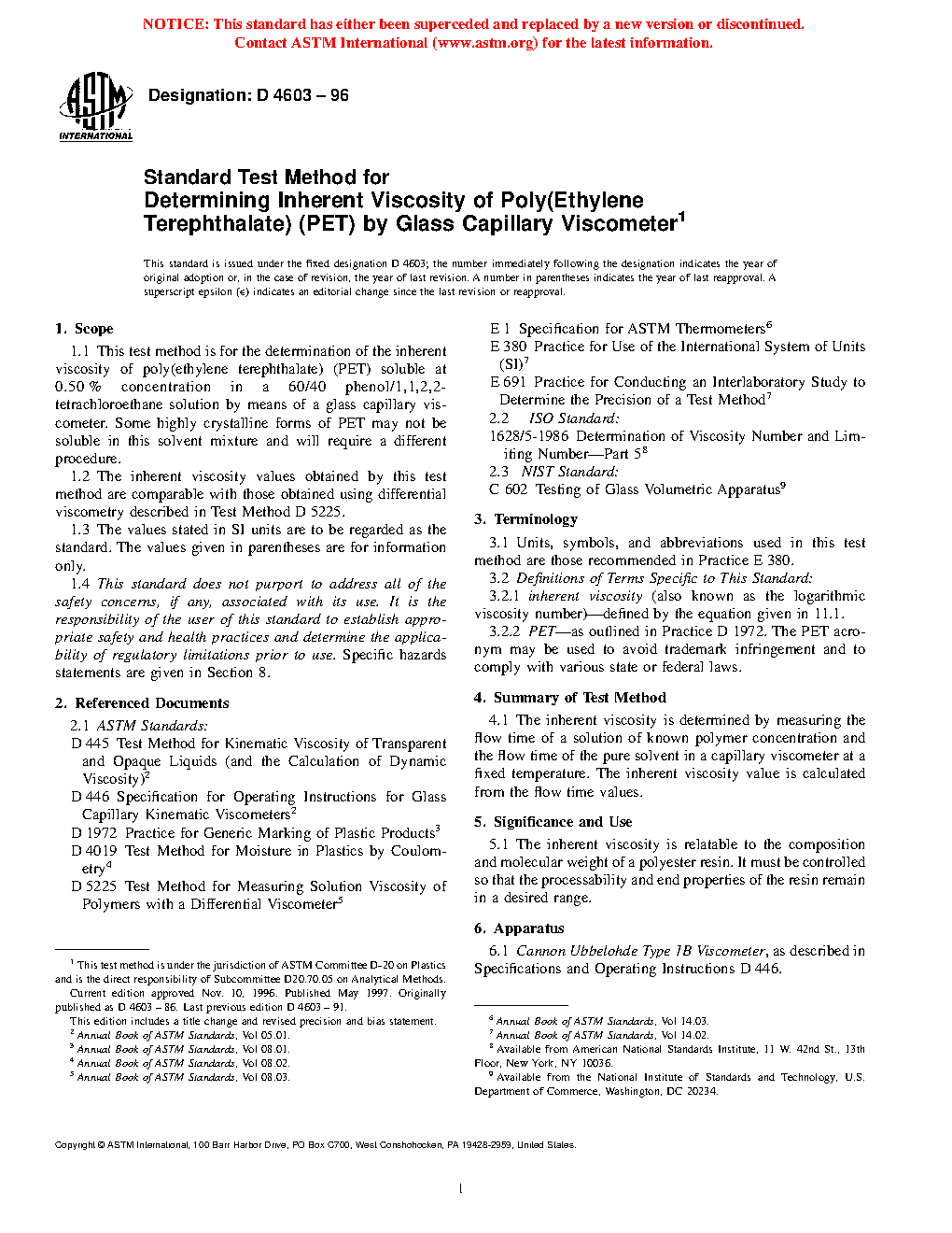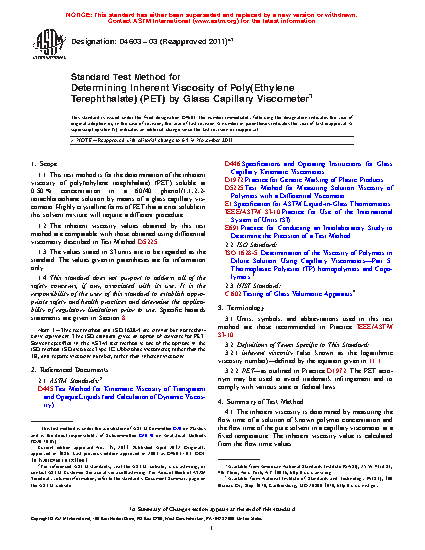 1.1 This test method is for the determination of the inherent viscosity of poly(ethylene terephthalate) (PET) soluble at 0.50 % concentration in a 60/40 phenol/1,1,2,2-tetrachloroethane solution by means of a glass capillary viscometer. Highly crystalline forms of PET that are not soluble in this solvent mixture will require a different procedure.