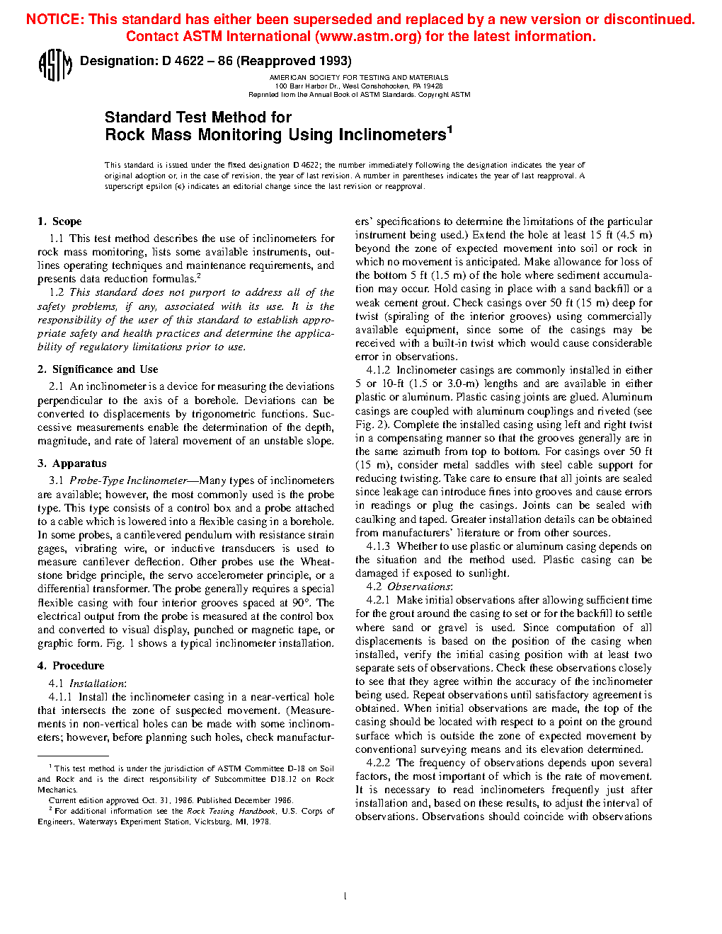 Standard Test Method for Rock Mass Monitoring Using Inclinometers (Withdrawn 2000)