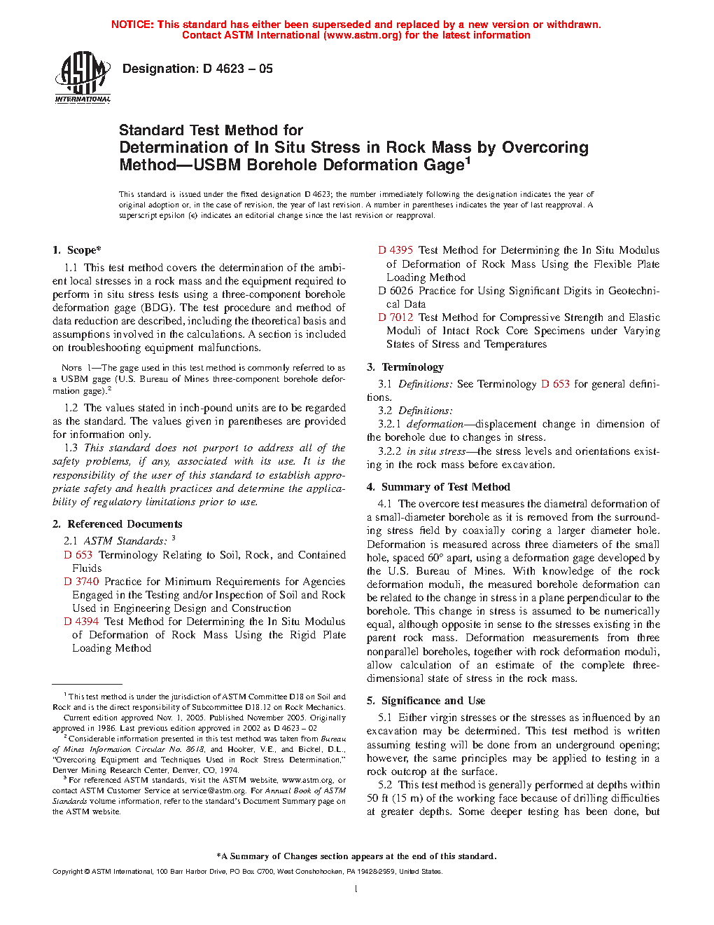 5.2 This test method is generally performed at depths within 50 ft (15 m) of the working face because of drilling difficulties at greater depths. Some deeper testing with this gauge has been done, but should be considered developmental. This test method has a long and proven record and considered very accurate relative to many other techniques, both new and old, out there. Other overcoring methods that use instruments that are different, but follow much of the same basic concepts are now available and can go deeper; however, the pros and cons of each method need to be carefully compared to this test method.