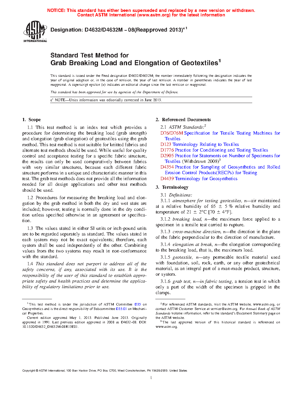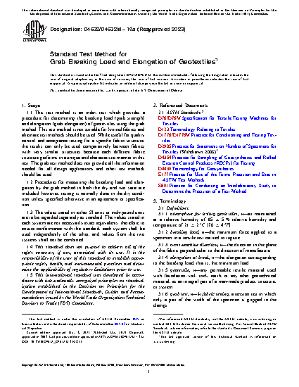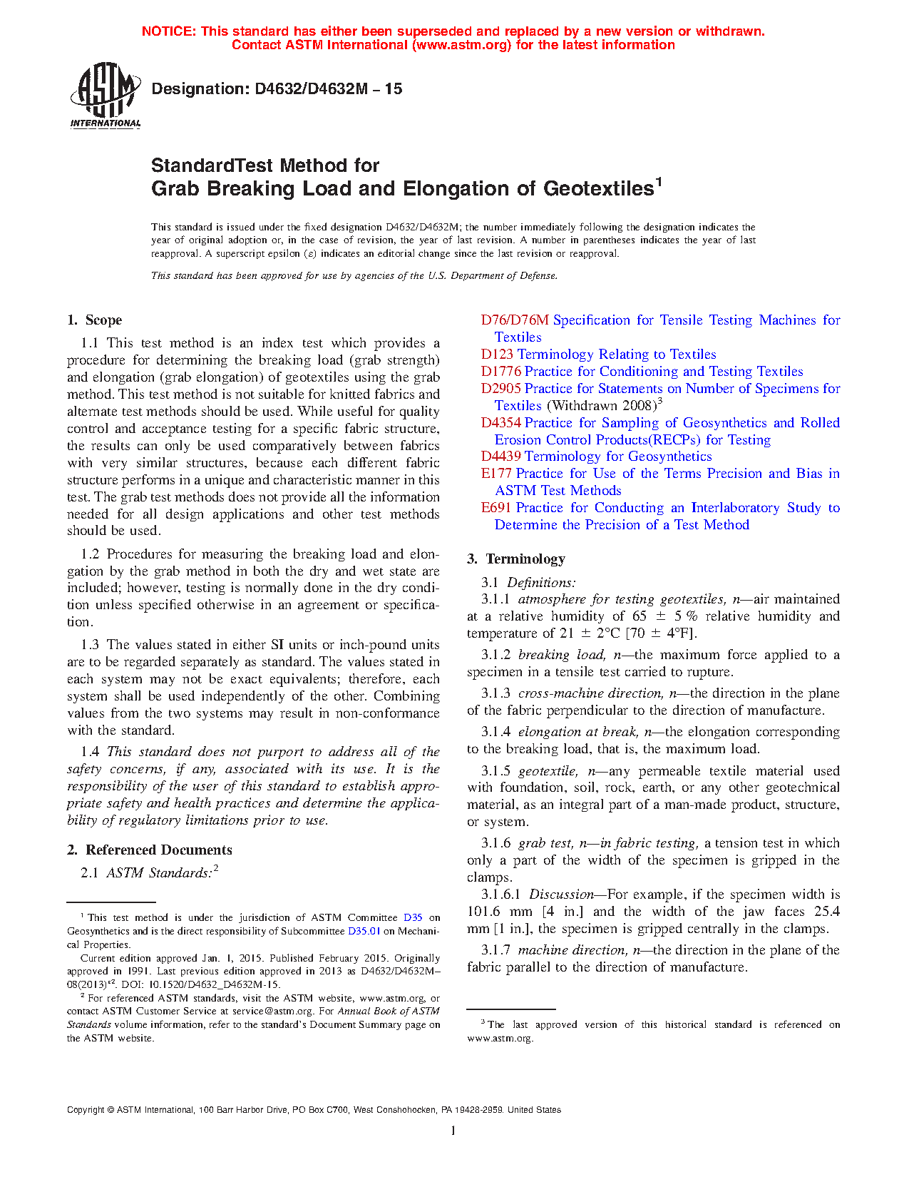 5.2 The procedure in Test Method D4632/D4632M for the determination of grab strength of geotextiles may be used for acceptance testing of commercial shipments, but caution is advised since information about between-laboratory precision is incomplete. Comparative tests as directed in 5.2.1 are advisable.