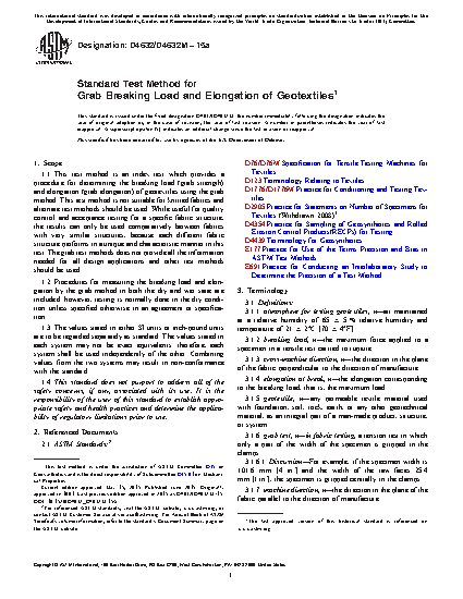 1.1 This test method is an index test which provides a procedure for determining the breaking load (grab strength) and elongation (grab elongation) of geotextiles using the grab method. This test method is not suitable for knitted fabrics and alternate test methods should be used. While useful for quality control and acceptance testing for a specific fabric structure, the results can only be used comparatively between fabrics with very similar structures, because each different fabric structure performs in a unique and characteristic manner in this test. The grab test methods does not provide all the information needed for all design applications and other test methods should be used.