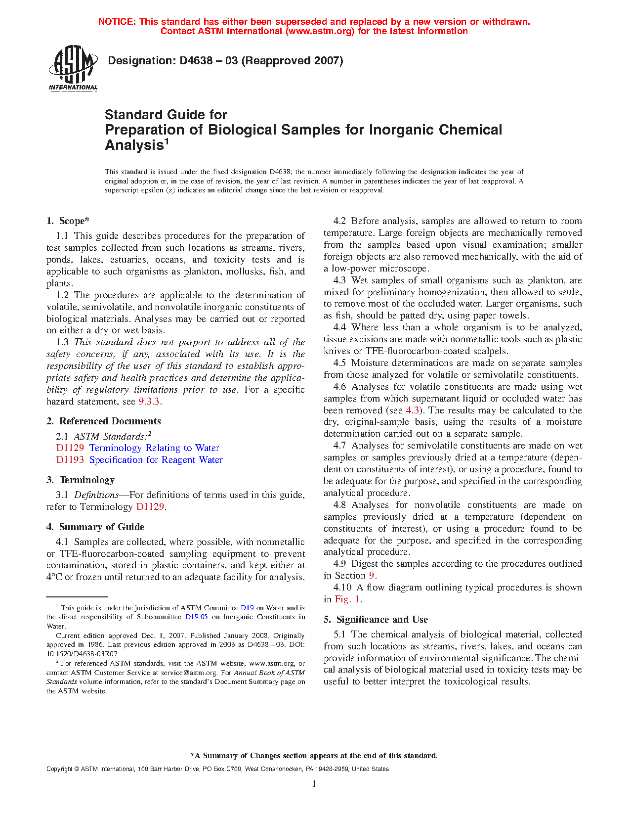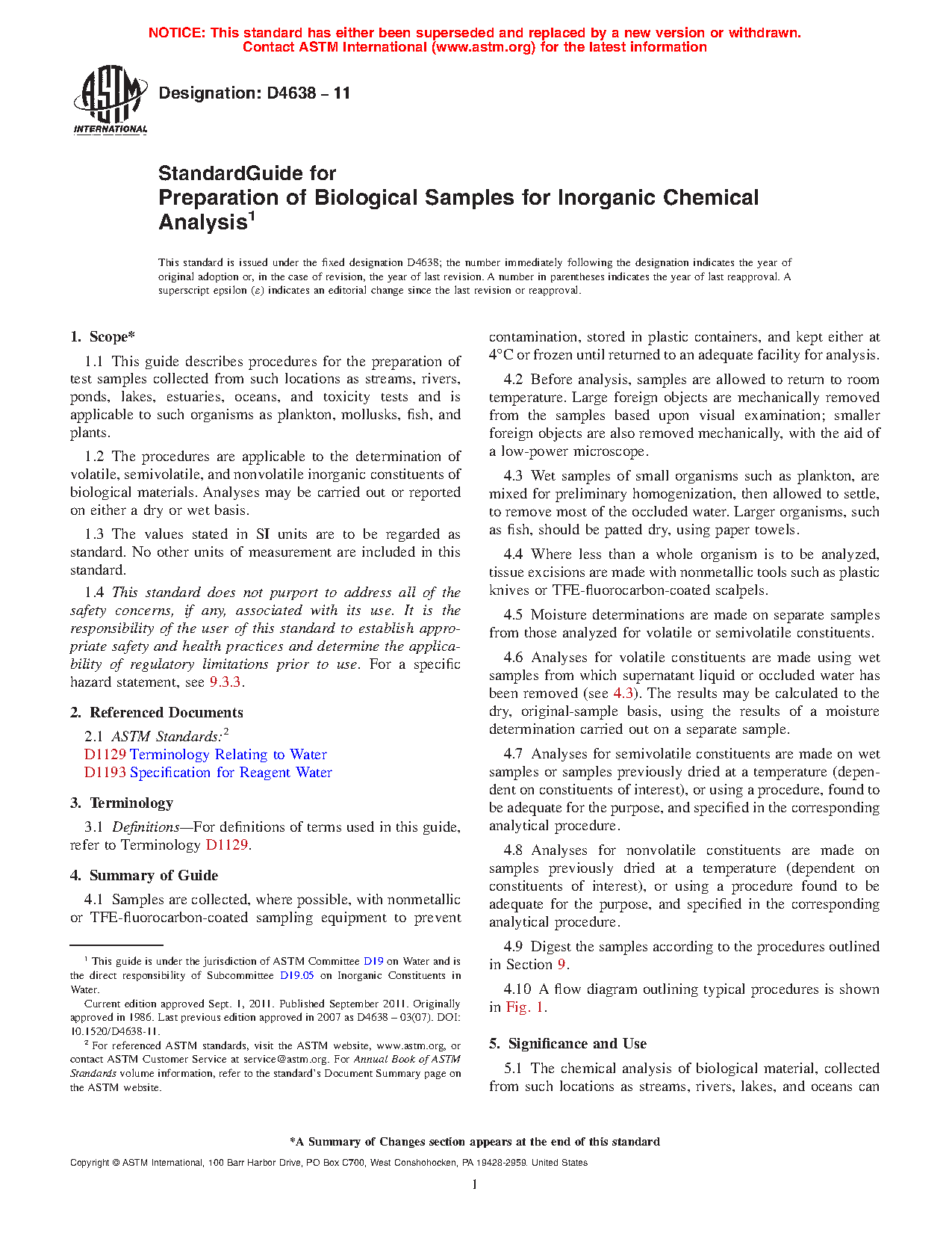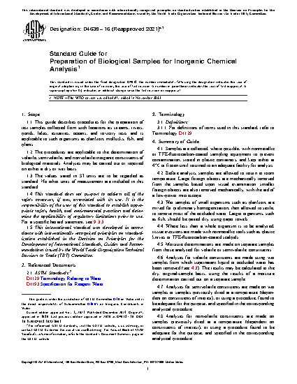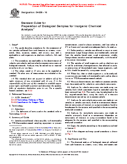 1.1 This guide describes procedures for the preparation of test samples collected from such locations as streams, rivers, ponds, lakes, estuaries, oceans, and toxicity tests and is applicable to such organisms as plankton, mollusks, fish, and plants.