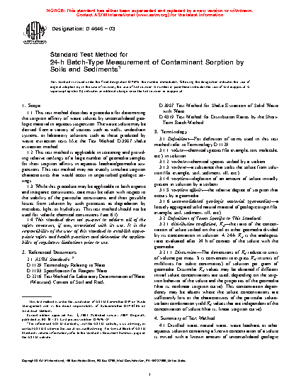 1.1 This test method describes a procedure for determining the sorption affinity of waste solutes by unconsolidated geologic material in aqueous suspension. The waste solute may be derived from a variety of sources such as wells, underdrain systems, or laboratory solutions such as those produced by waste extraction tests like the Practice D3987 shake extraction method.