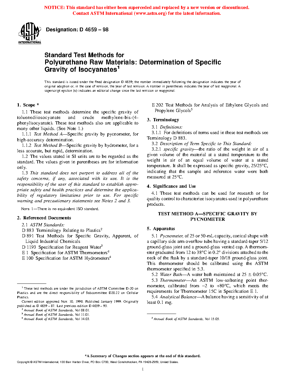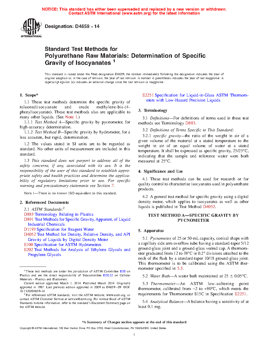 4.2 A general test method for specific gravity using a digital density meter, which applies to isocyanates as well as other liquids is published in Test Method D4052.