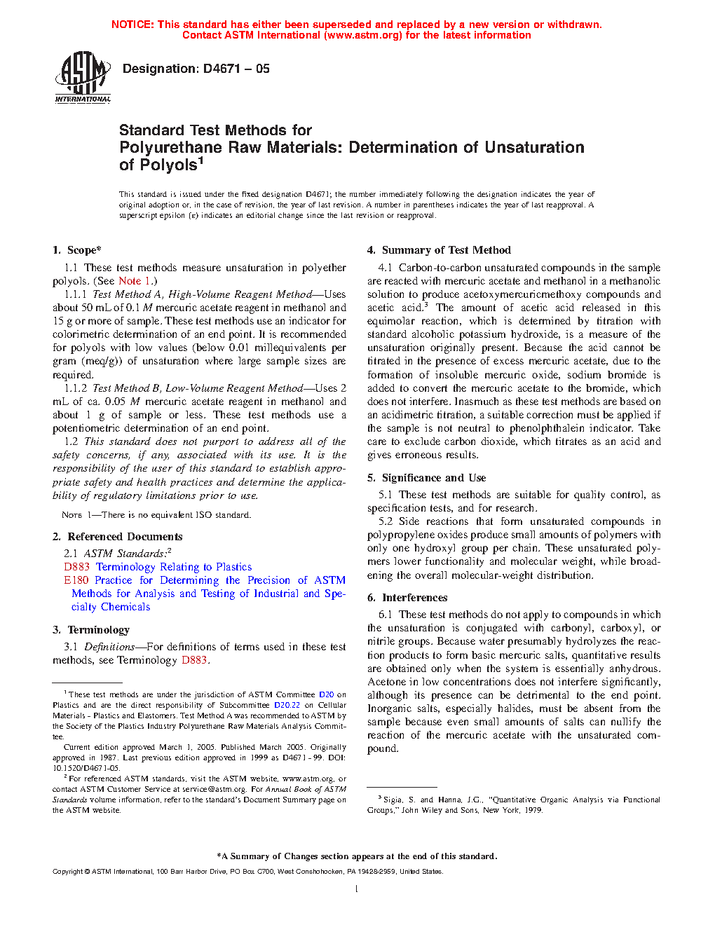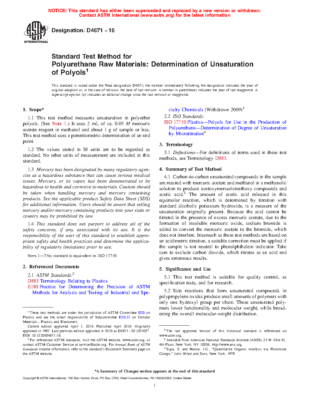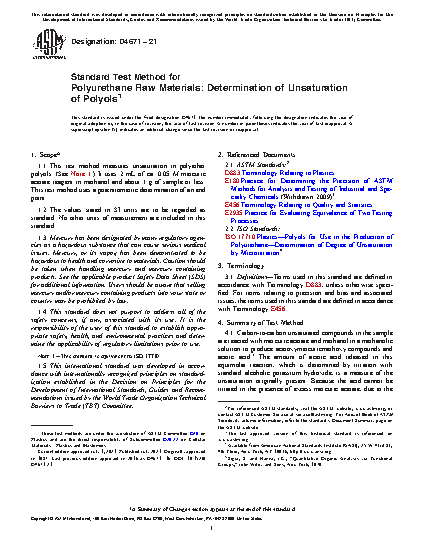 1.1 This test method measures unsaturation in polyether polyols. (See Note 1.) It uses 2 mL of ca. 0.05 M mercuric acetate reagent in methanol and about 1 g of sample or less. This test method uses a potentiometric determination of an end point.