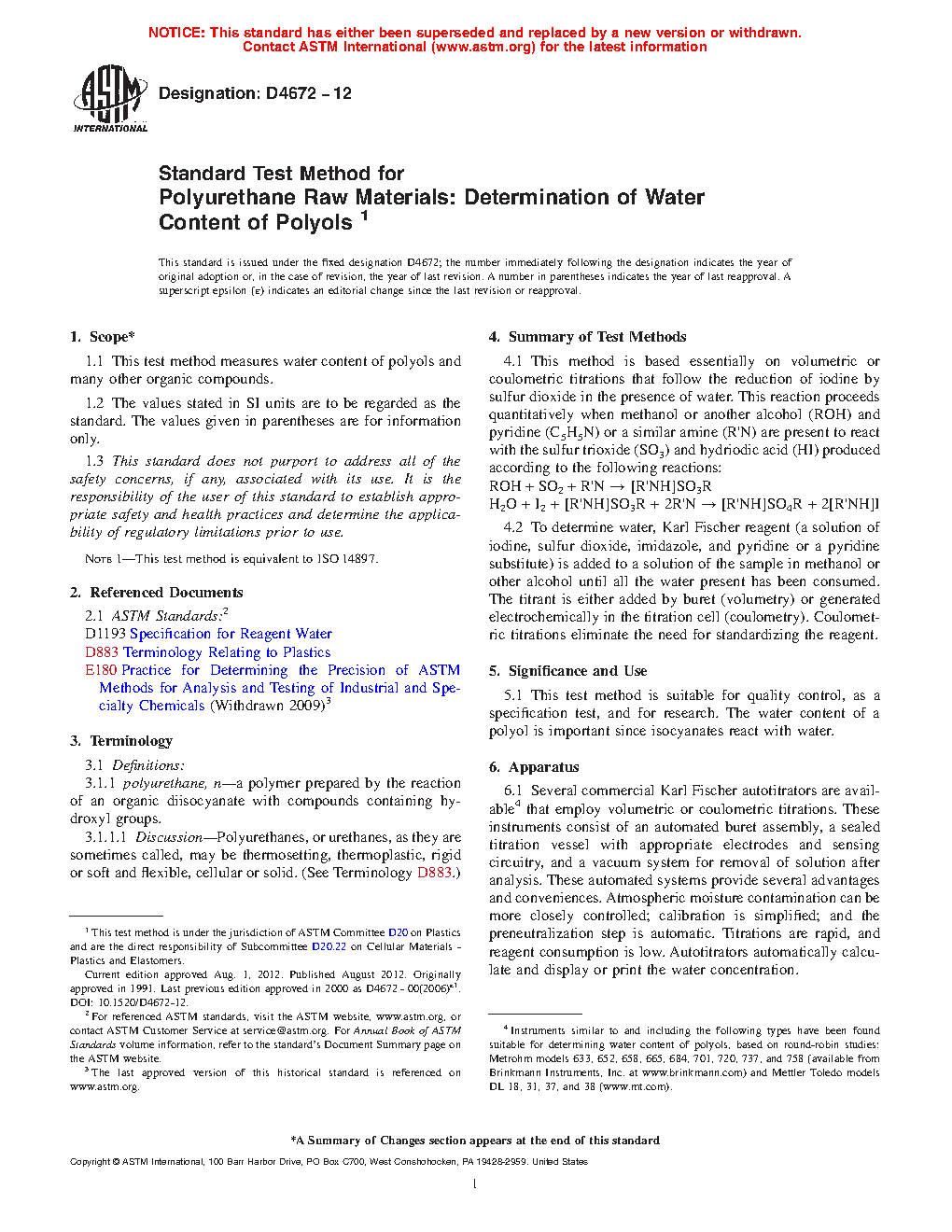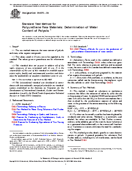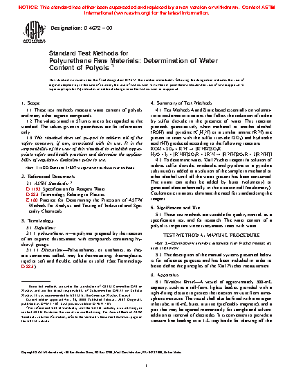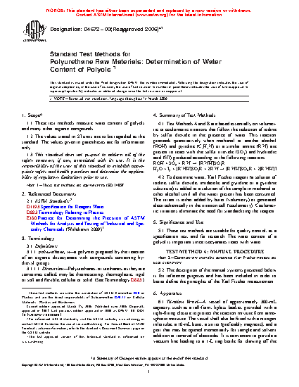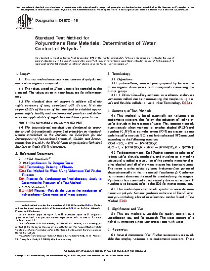 5.1 This test method is suitable for quality control, as a specification test, and for research. The water content of a polyol is important since isocyanates react with water.