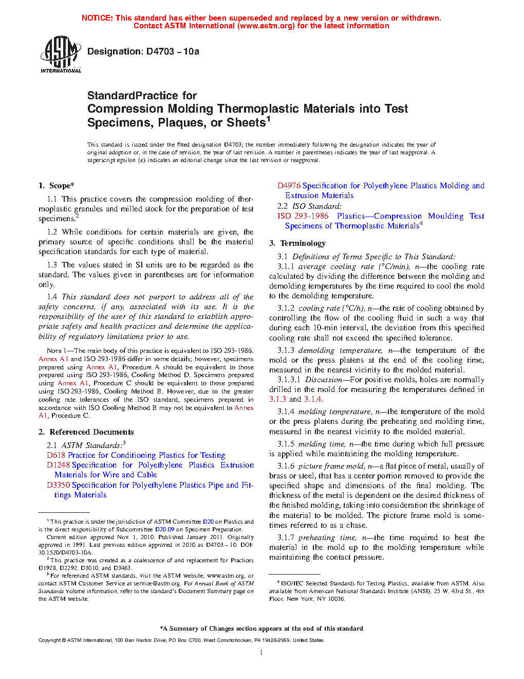Note 1: The main body of this practice is equivalent to ISO 293-1986. Annex A1 and ISO 293-1986 differ in some details; however, specimens prepared using Annex A1, Procedure A should be equivalent to those prepared using ISO 293-1986, Cooling Method D. Specimens prepared using Annex A1, Procedure C should be equivalent to those prepared using ISO 293-1986, Cooling Method B. However, due to the greater cooling rate tolerances of the ISO standard, specimens prepared in accordance with ISO Cooling Method B may not be equivalent to Annex A1, Procedure C.