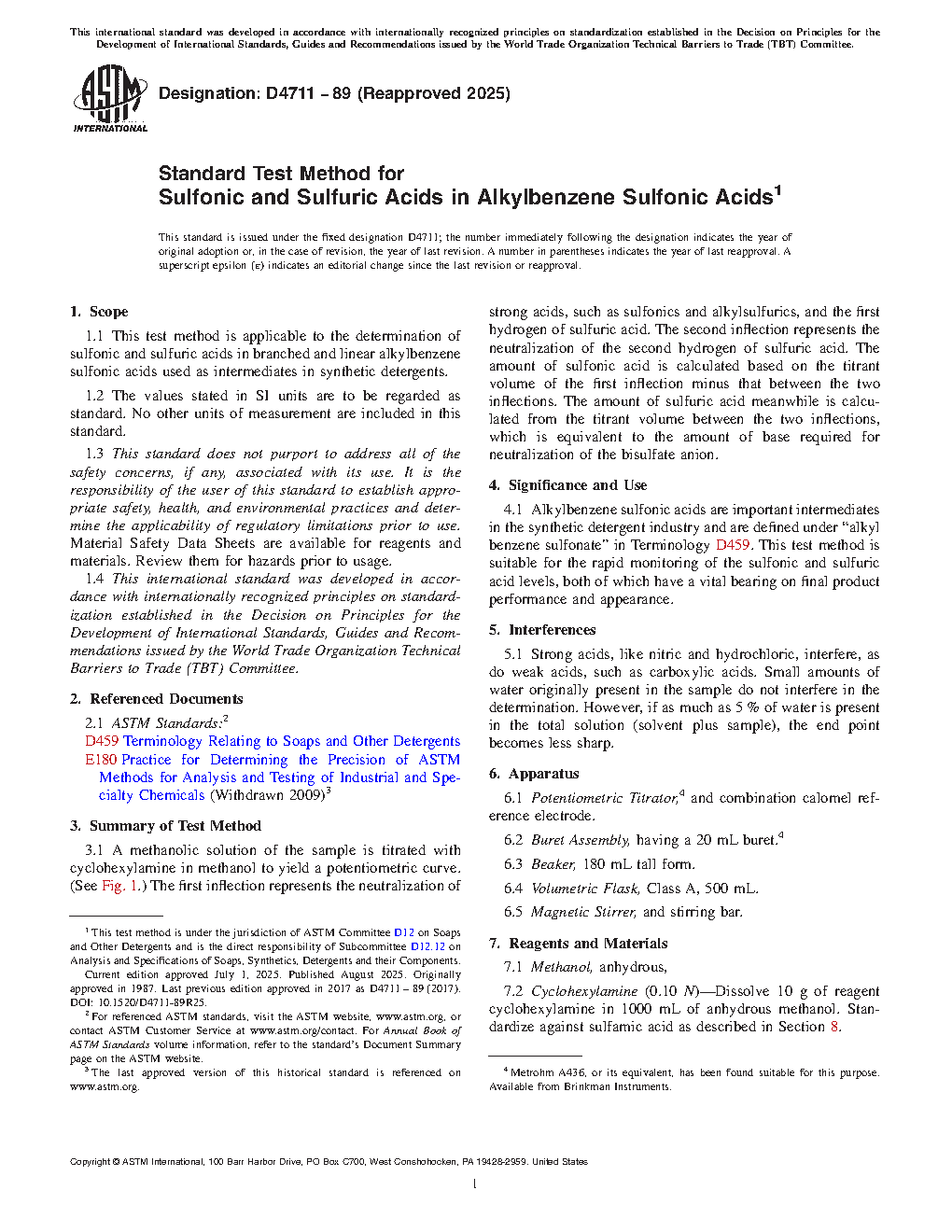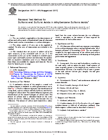 4.1 Alkylbenzene sulfonic acids are important intermediates in the synthetic detergent industry and are defined under “alkyl benzene sulfonate” in Terminology D459. This test method is suitable for the rapid monitoring of the sulfonic and sulfuric acid levels, both of which have a vital bearing on final product performance and appearance.