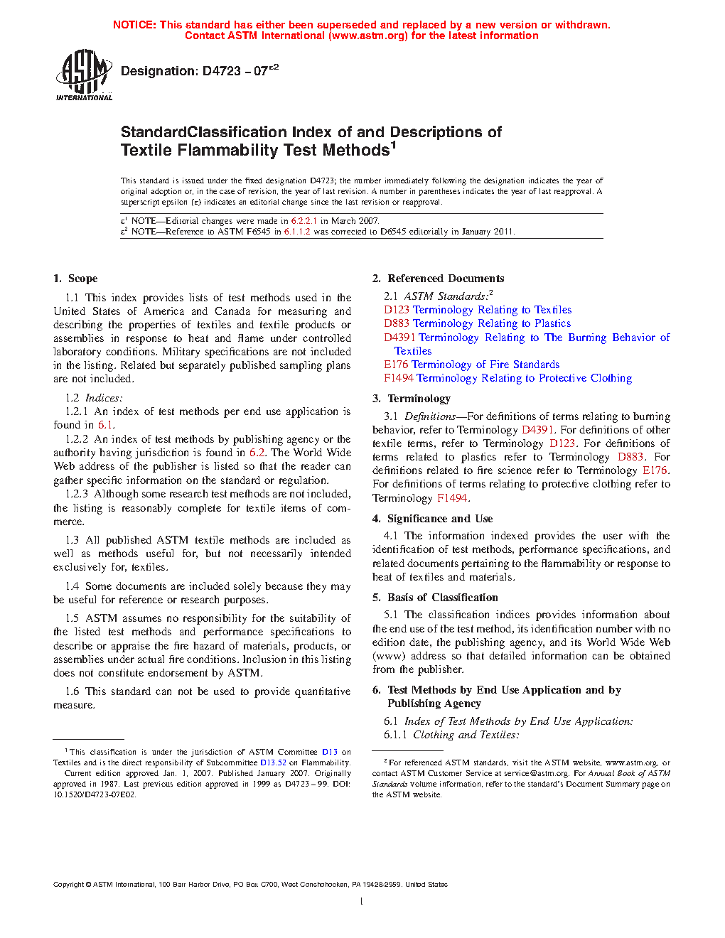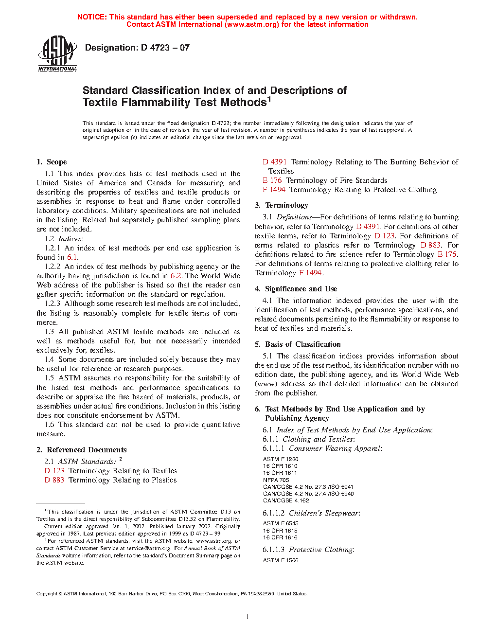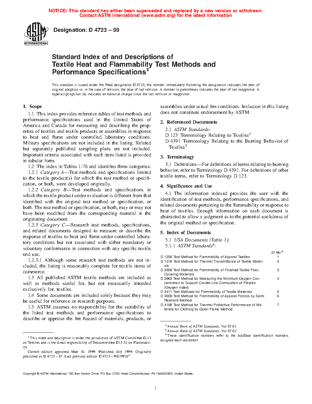 1.1 This index provides reference tables of test methods and performance specifications used in the United States of America and Canada for measuring and describing the properties of textiles and textile products or assemblies in response to heat and flame under controlled laboratory conditions. Military specifications are not included in the listing. Related but separately published sampling plans are not included. Important criteria associated with each item listed is provided in tabular form.