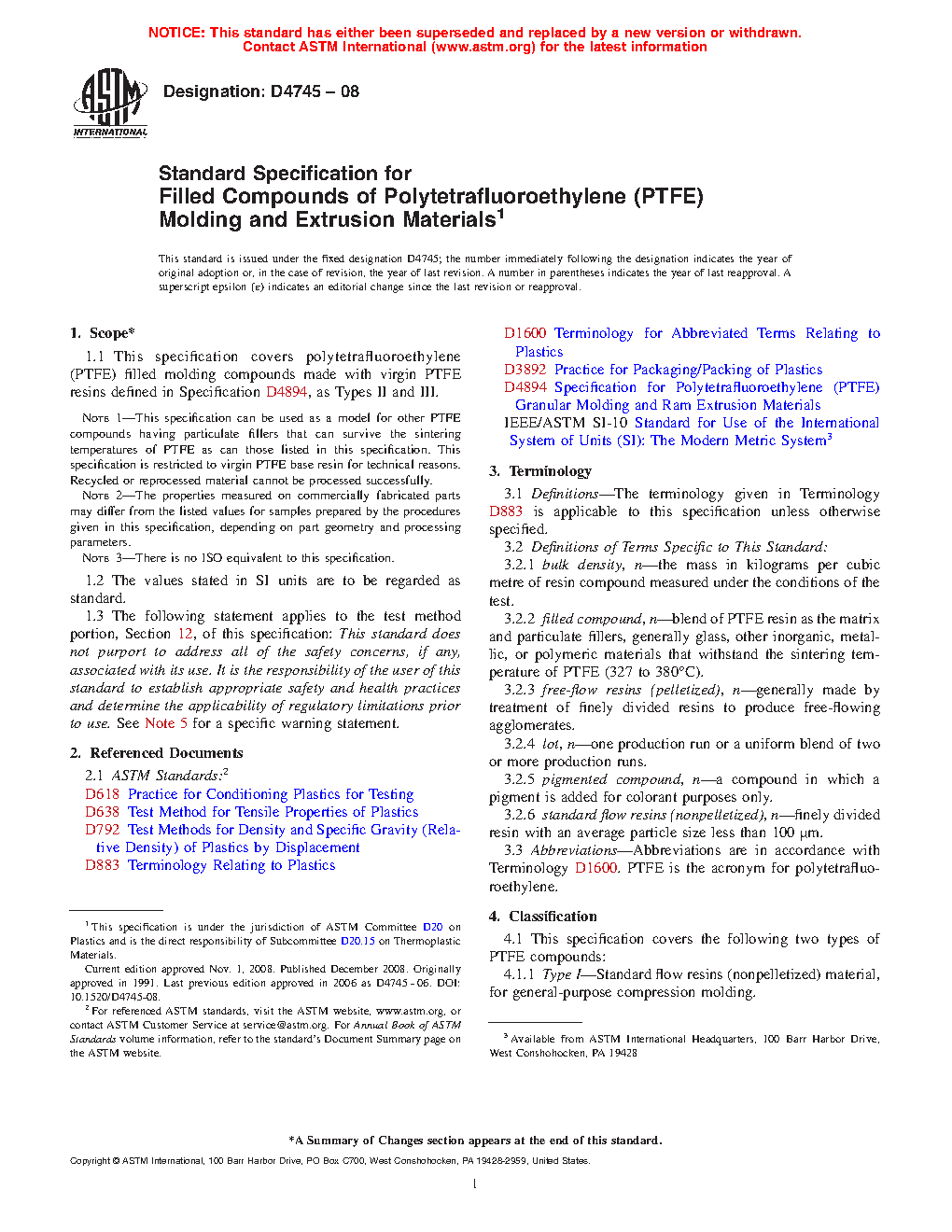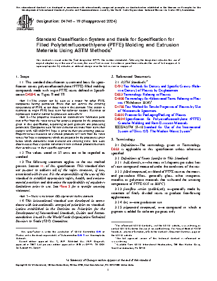 1.1 This standard classification system and basis for specification covers polytetrafluoroethylene (PTFE) filled molding compounds made with virgin PTFE resins defined in Specification D4894, as Types II and III.