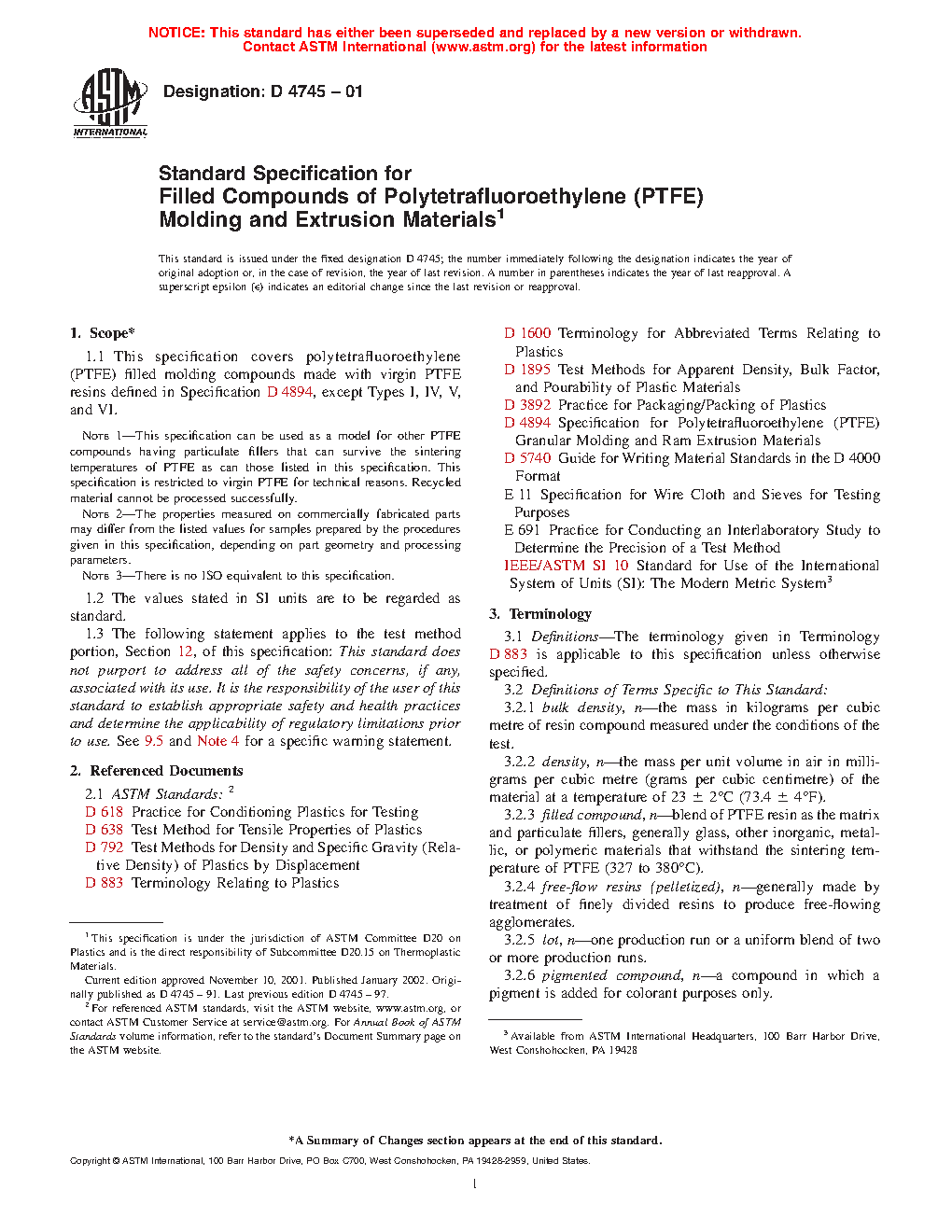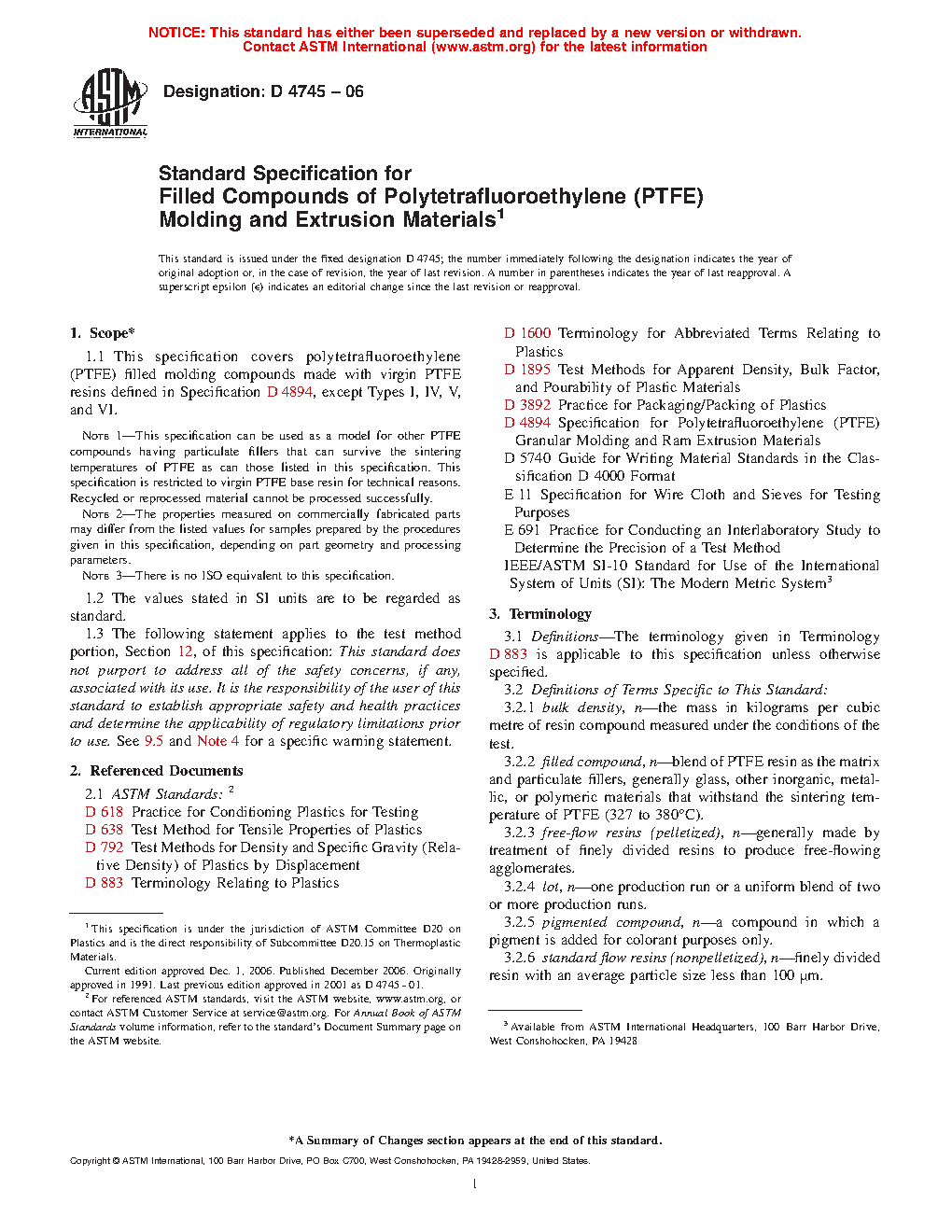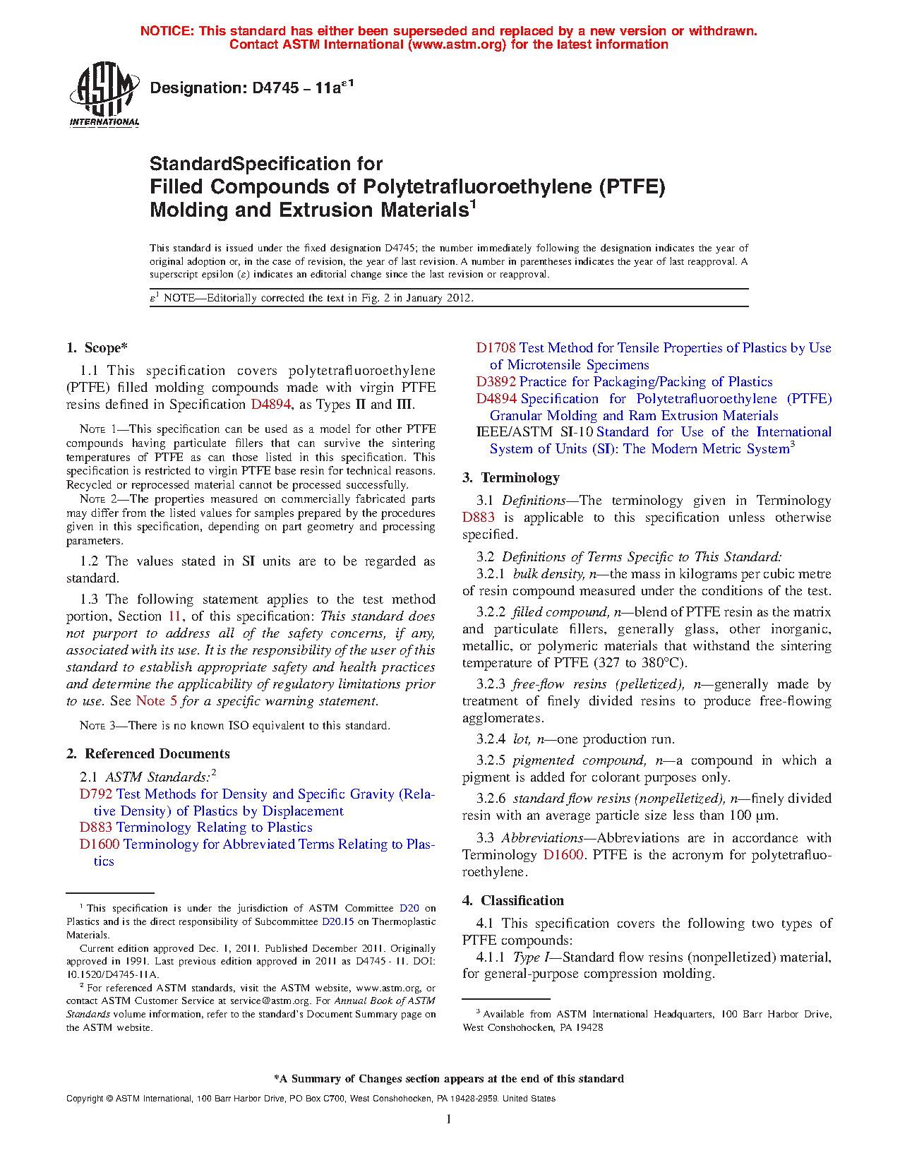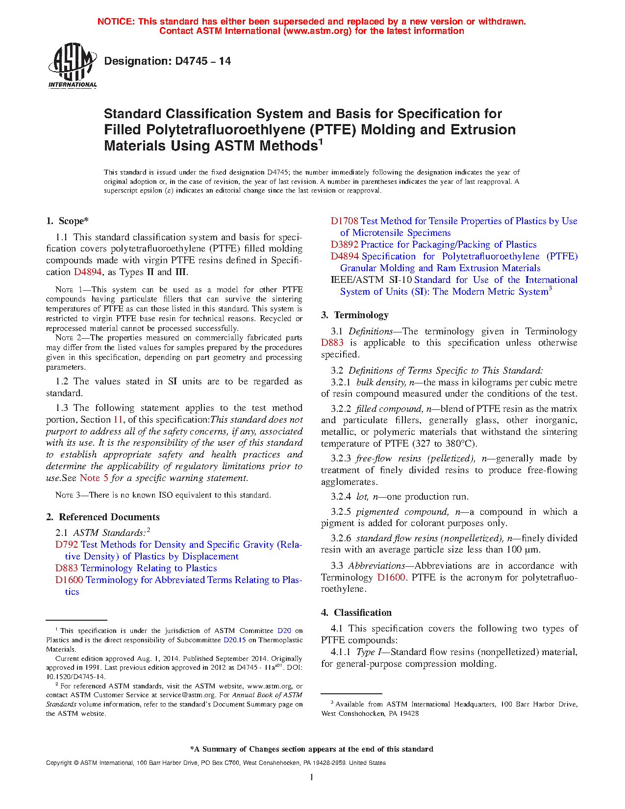 Note 2: The properties measured on commercially fabricated parts may differ from the listed values for samples prepared by the procedures given in this specification, depending on part geometry and processing parameters. Compounds used for ram extrusion are made from resins that comply with ASTM-D4745 Type II prior to their pre-sintering process. Property values measured on extruded products will vary from the listed values for Type II compounds which are prepared by the procedures given below which standardize mold diameter and sintering cycle. End users should assess these expected variations in ram extruded products to ensure their suitable use in their specific application.