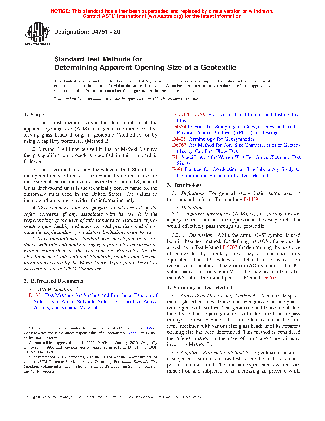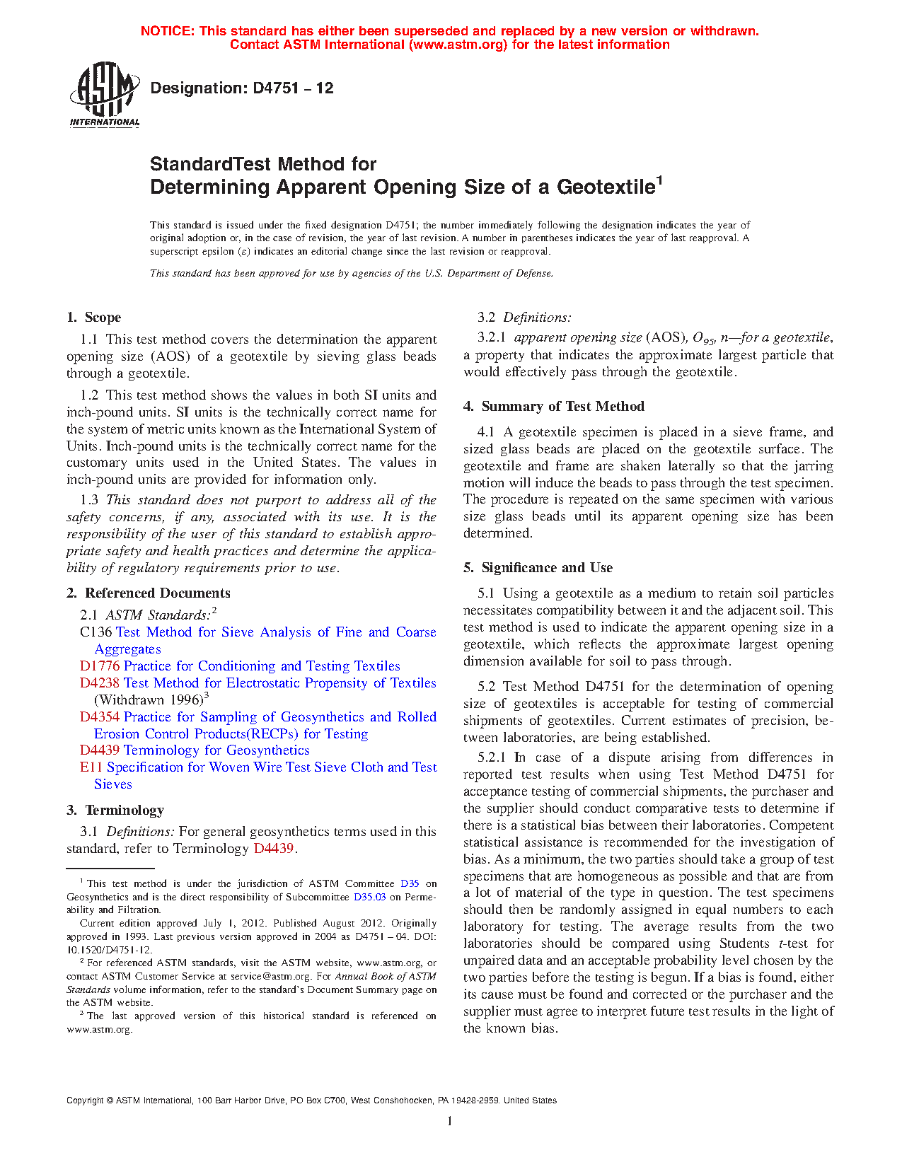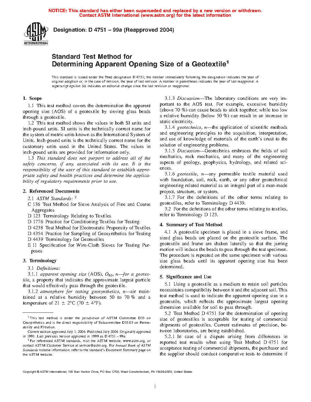 1.1 This test method is used to determine the apparent opening size (AOS) of a geotextile by sieving glass beads through a geotextile.