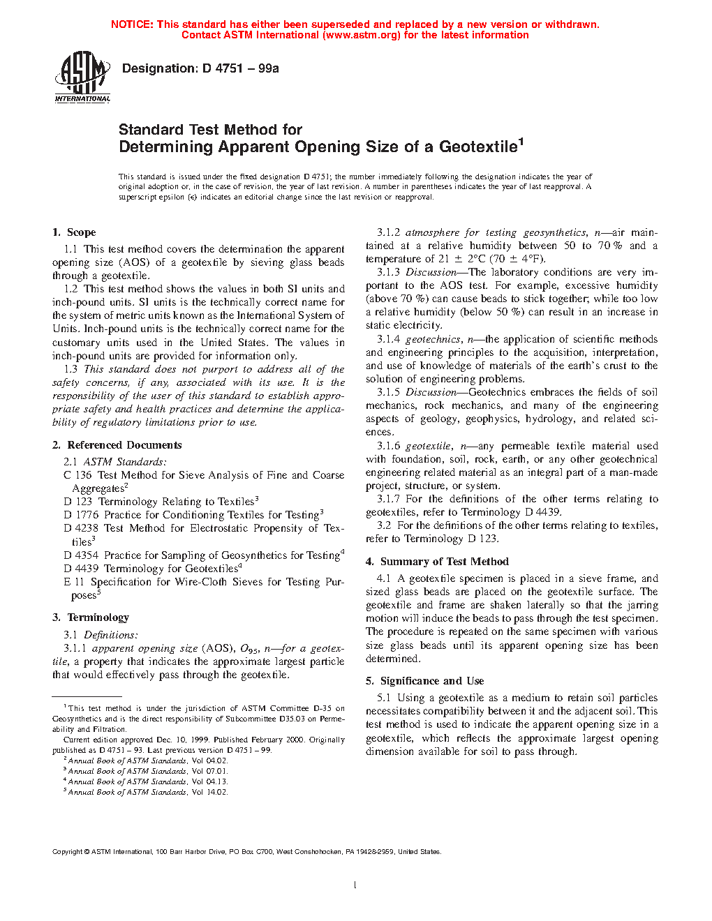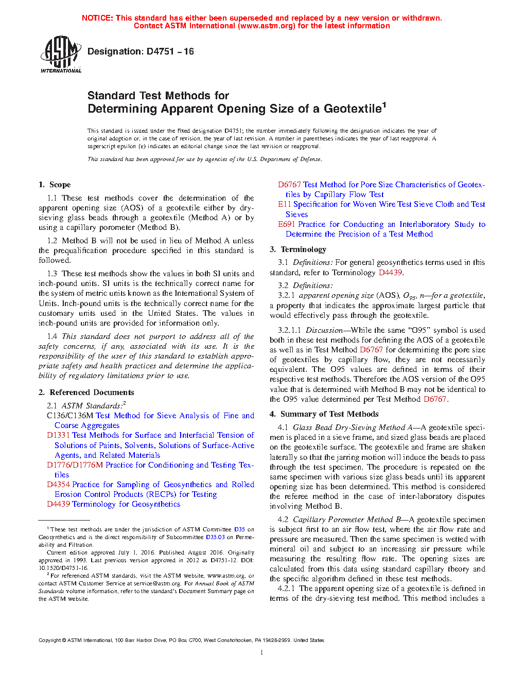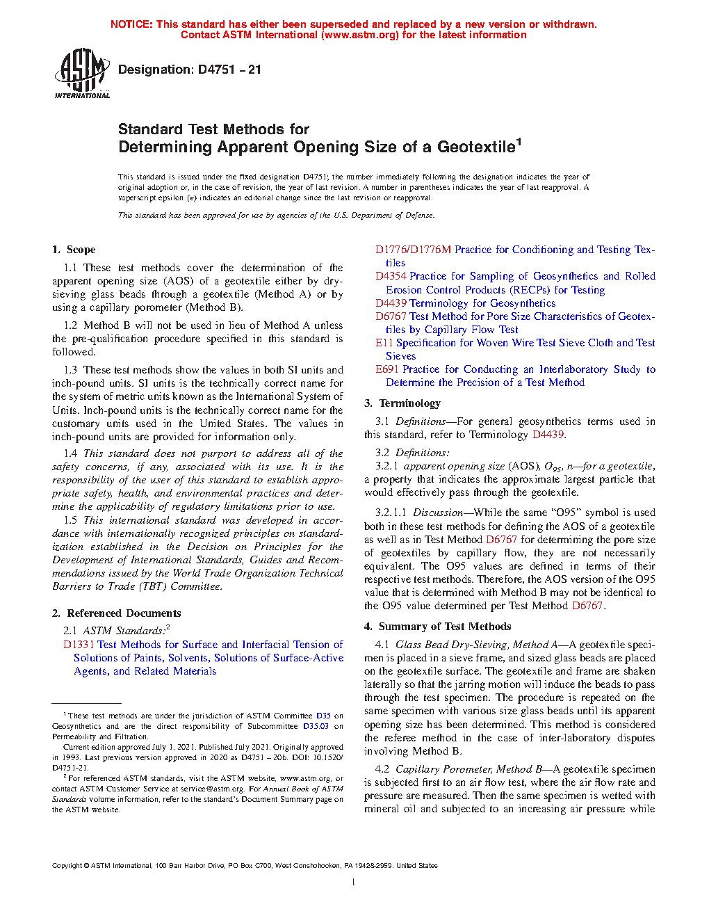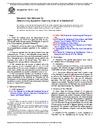 1.1 This test method is used to determine the apparent opening size (AOS) of a geotextile by sieving glass beads through a geotextile.