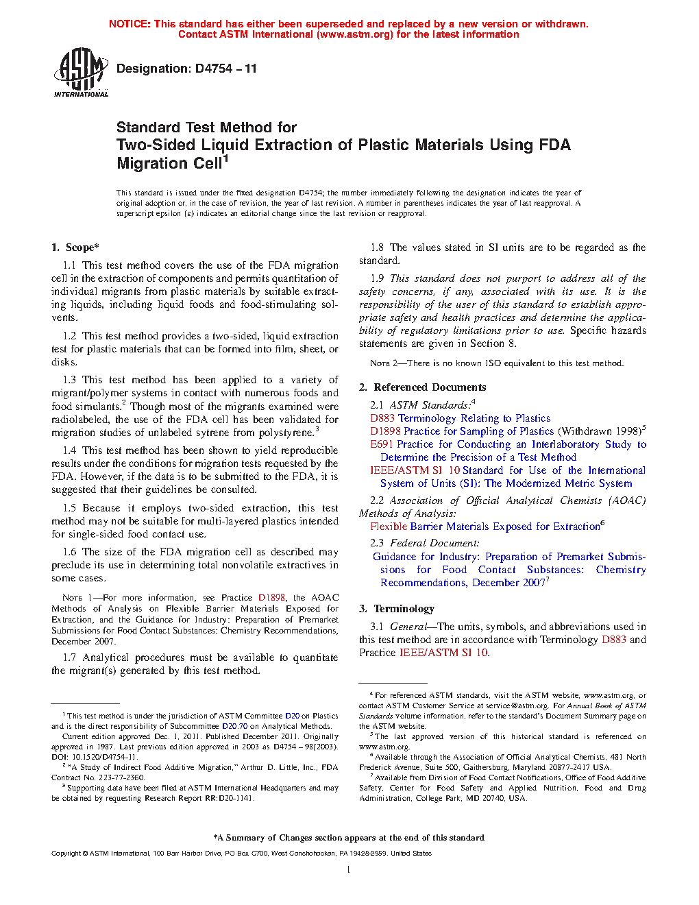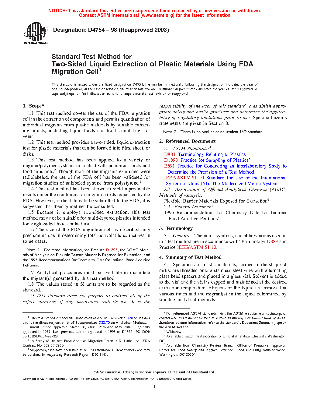 1.1 This test method covers the use of the FDA migration cell in the extraction of components and permits quantitation of individual migrants from plastic materials by suitable extracting liquids, including liquid foods and food-stimulating solvents.
