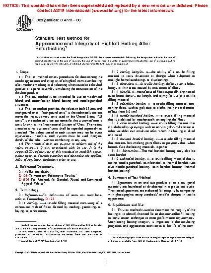 1.1 This test method covers procedures for determining the appearance and integrity of man-made fiber batting after machine washing or drycleaning when tested in a finished garment or a panel assembly simulating the construction of the finished garment.