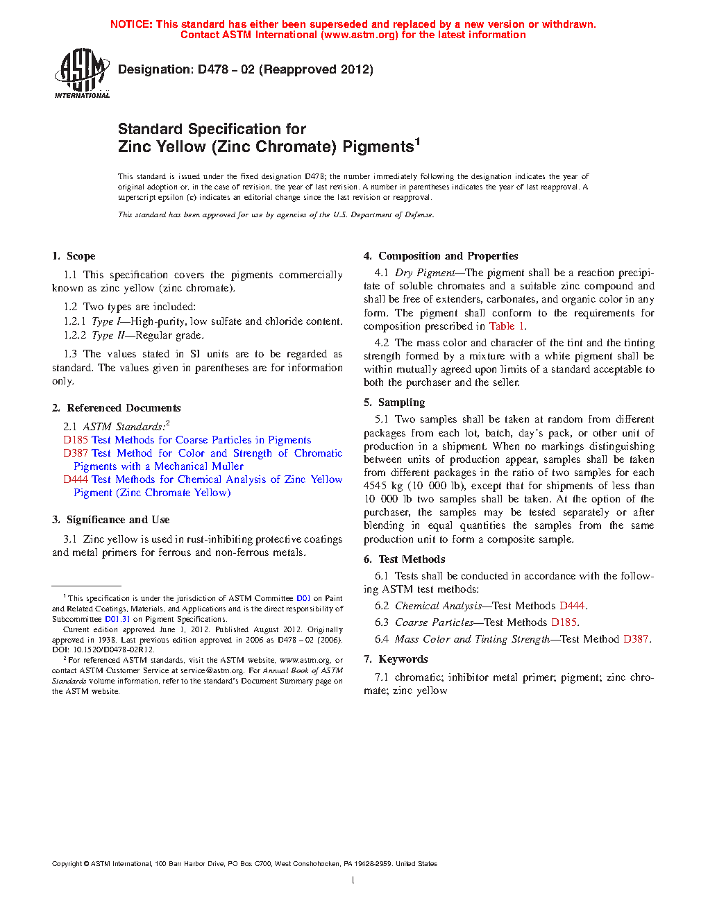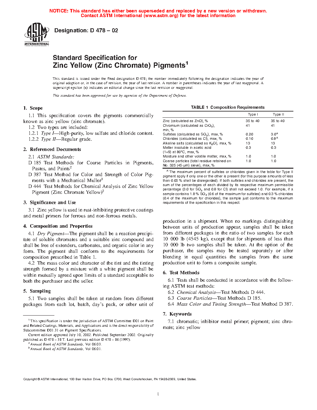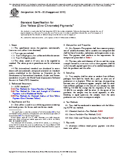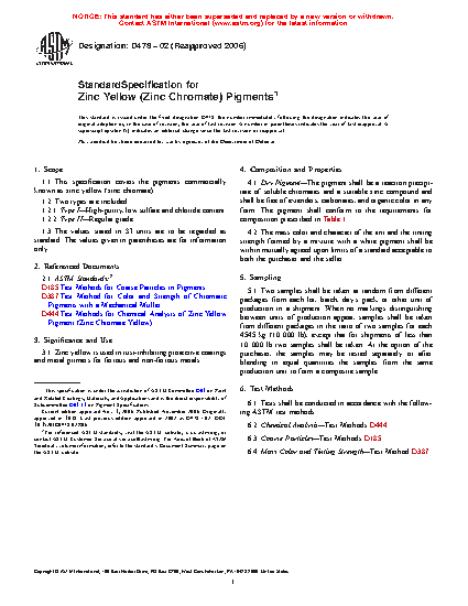 This specification covers zinc yellow (zinc chromate) pigments used in rust-inhibiting protective coatings and metal primers for ferrous and non-ferrous metals. The two types of pigments include: Type I and Type II. The pigment shall conform to the required composition for zinc, chromium, sulfates, chlorides, alkaline slats, matter insoluble in acetic acid, moisture and other volatile matter, and coarse particles. The following tests shall be conducted: chemical analysis, coarse particles, and mass color and tinting strength.