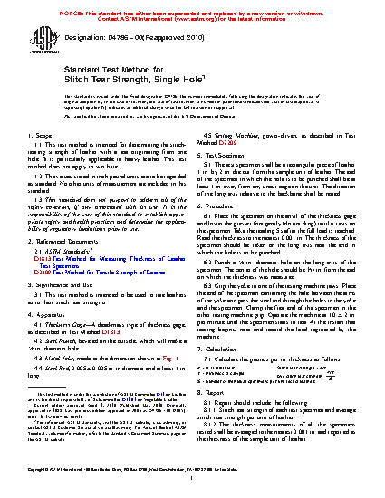 1.1 This test method is intended for determining the stitch-tearing strength of leather with a tear originating from one hole. It is particularly applicable to heavy leather. This test method does not apply to wet blue.
