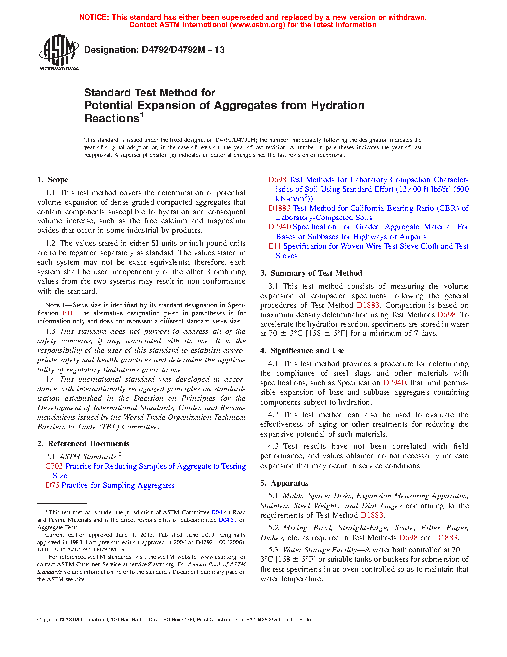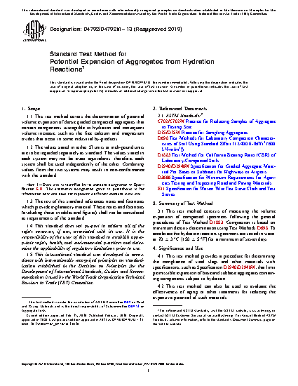 1.1 This test method covers the determination of potential volume expansion of dense graded compacted aggregates that contain components susceptible to hydration and consequent volume increase, such as the free calcium and magnesium oxides that occur in some industrial by-products.