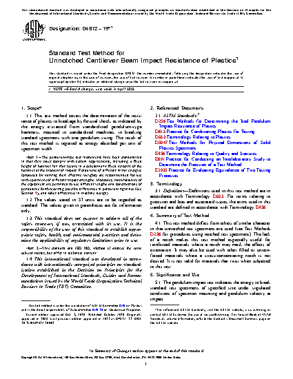 Note 1-The machines with their pendulum-type hammers have been standardized in that they must comply with certain requirements, including a fixed height of hammer fall that results in a substantially fixed velocity of the hammer at the moment of impact. Hammers of different initial energies (produced by varying their effective weights) are recommended for use with specimens of different impact strengths. Moreover, manufacturers of the equipment are permitted to use different lengths and constructions of pendulums (with resulting possible differences in pendulum rigidities (see Section 4), and other differences in machine design).1.2 The values stated in SI units are to be regarded as the standard. The values given in parentheses are for information only.