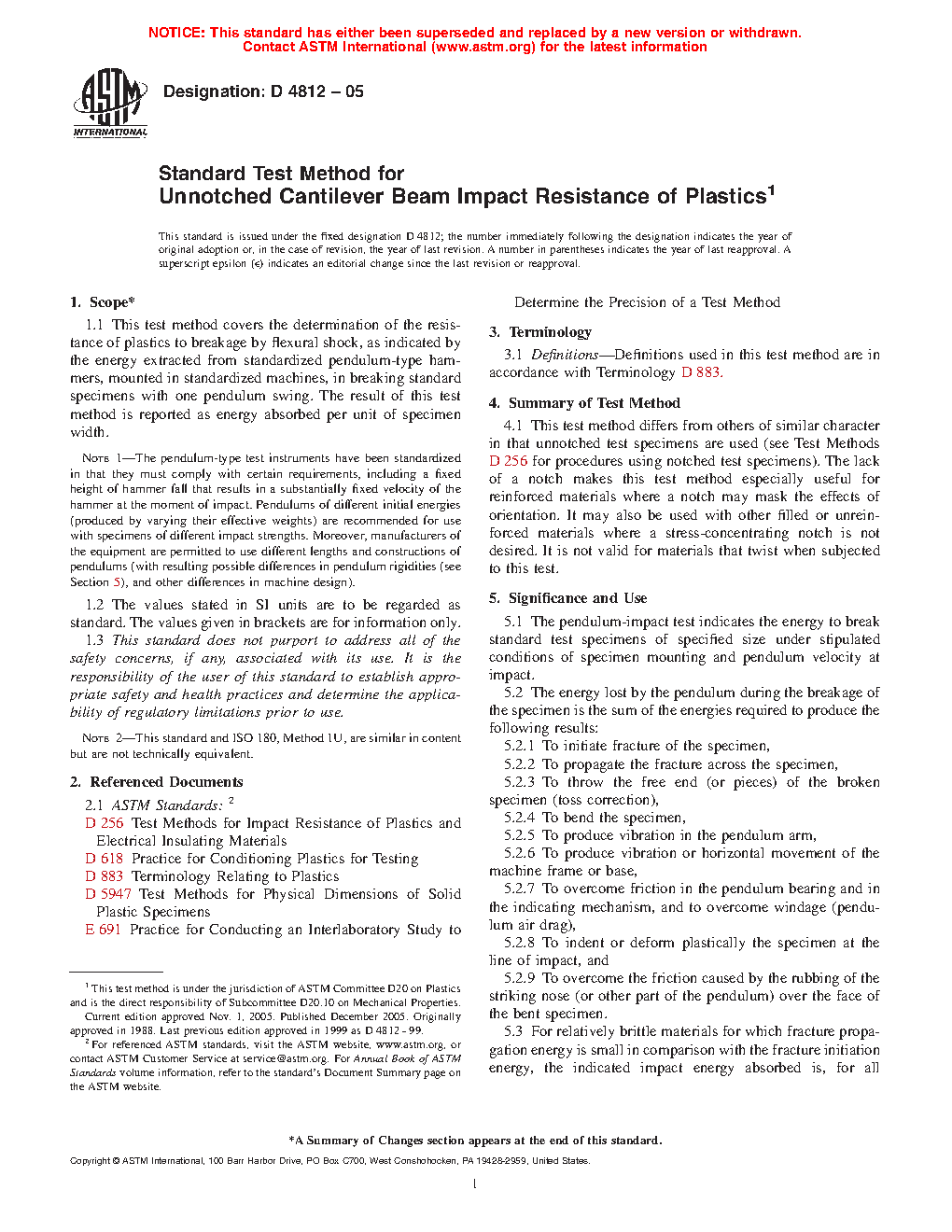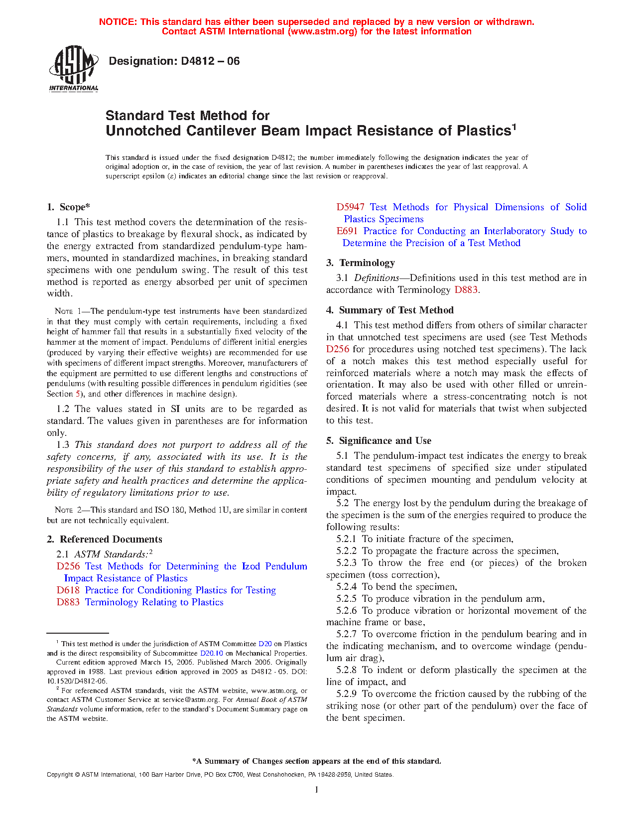1.1 This test method covers the determination of the resistance to breakage by flexural shock of plastics, as indicated by the energy extracted from standardized (Note 1) pendulum-type hammers, mounted in standardized machines, in breaking standard specimens with one pendulum swing. The result of this test is reported in terms of impact strength per unit of specimen width.