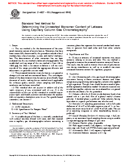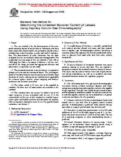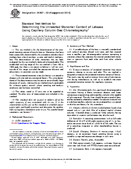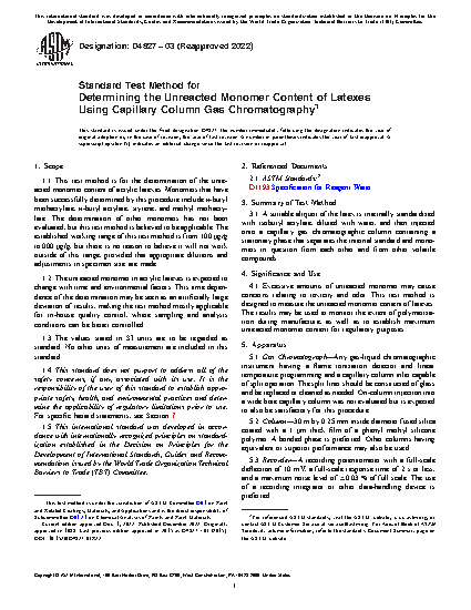 1.2 The unreacted monomer in acrylic latexes is expected to change with time and environmental factors. This time dependence of the determination may be seen as an artificially large deviation of results, making the test method mostly applicable for in-house quality control, where sampling and analysis conditions can be better controlled.
