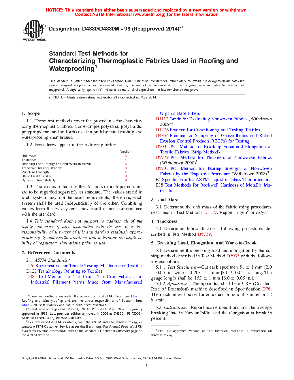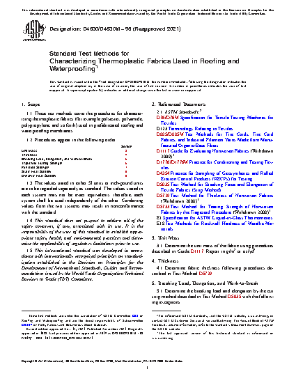 1.1 These test methods cover the procedures for characterizing thermoplastic fabrics (for example polyester, polyamide, polypropylene, and so forth) used in prefabricated roofing and waterproofing membranes.