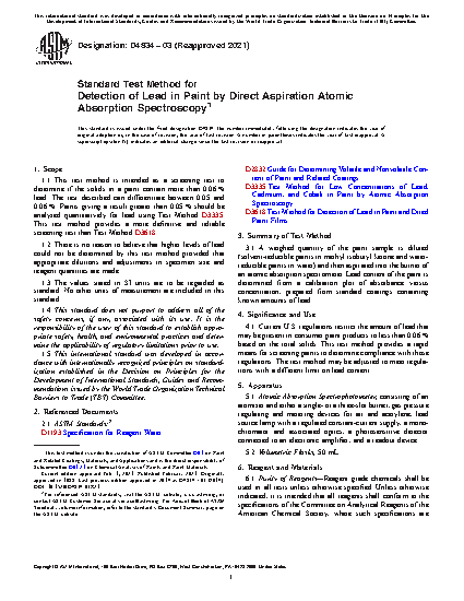 1.1 This test method is intended as a screening test to determine if the solids in a paint contain more than 0.06 % lead. The test described can differentiate between 0.05 and 0.06 %. Paints giving a result greater than 0.05 % should be analyzed quantitatively for lead using Test Method D3335. This test method provides a more definitive and reliable screening test than Test Method D3618.