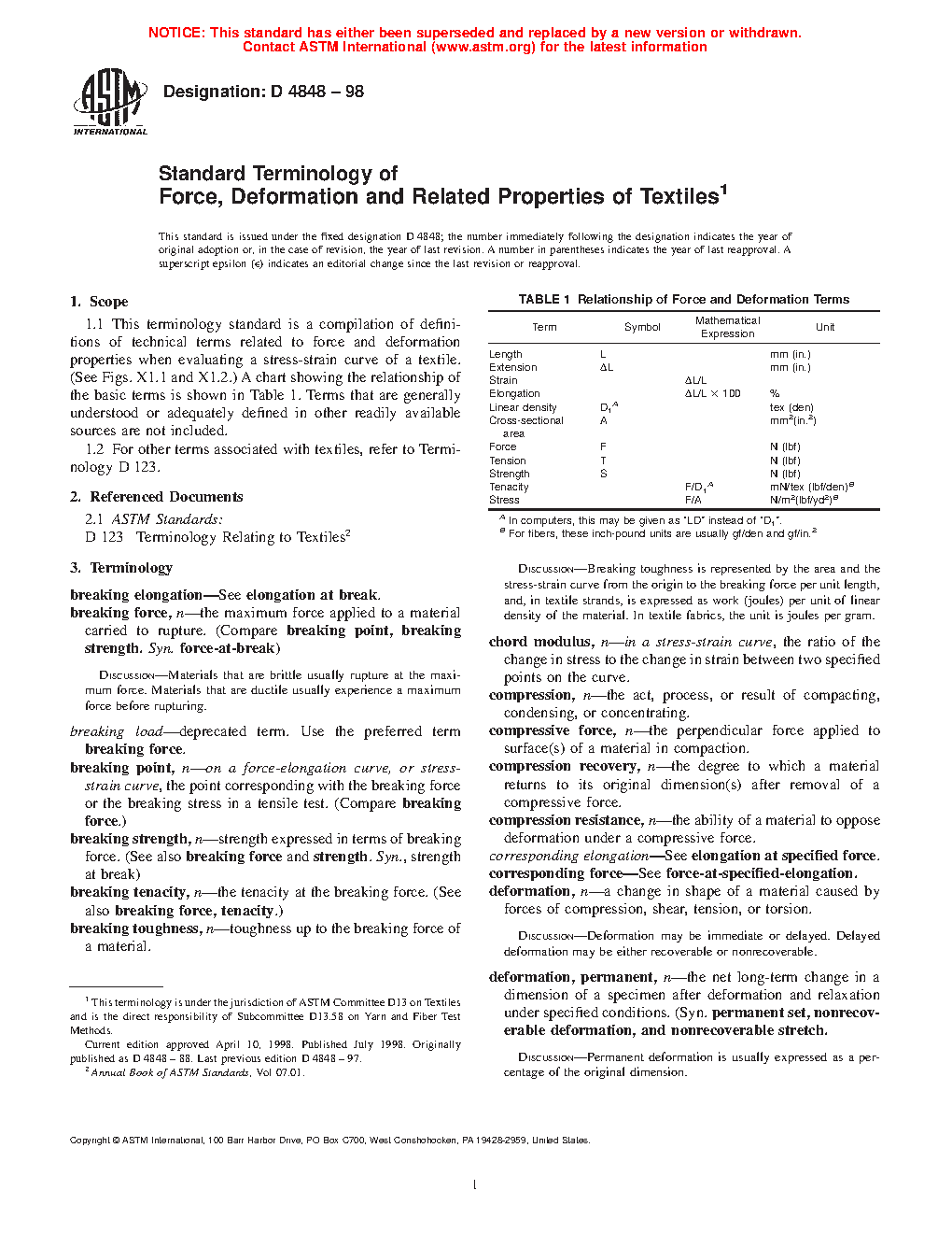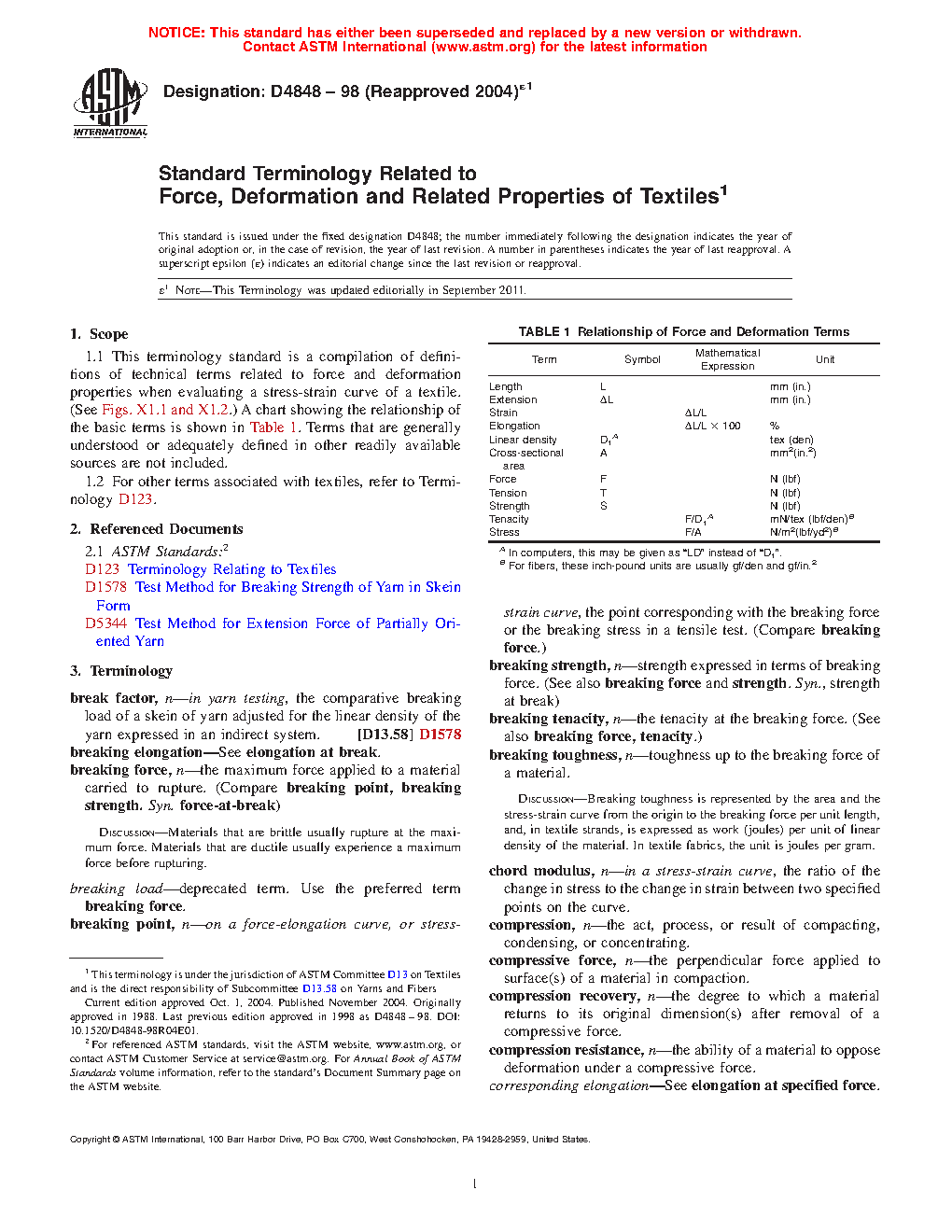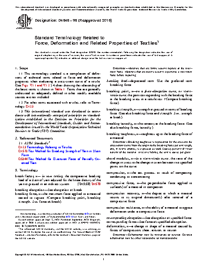 Standard Terminology of Force, Deformation and Related Properties of Textiles