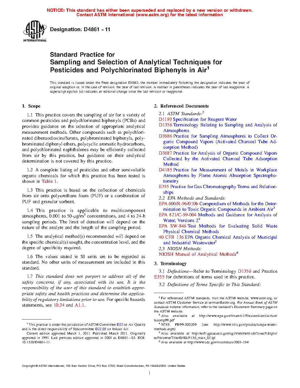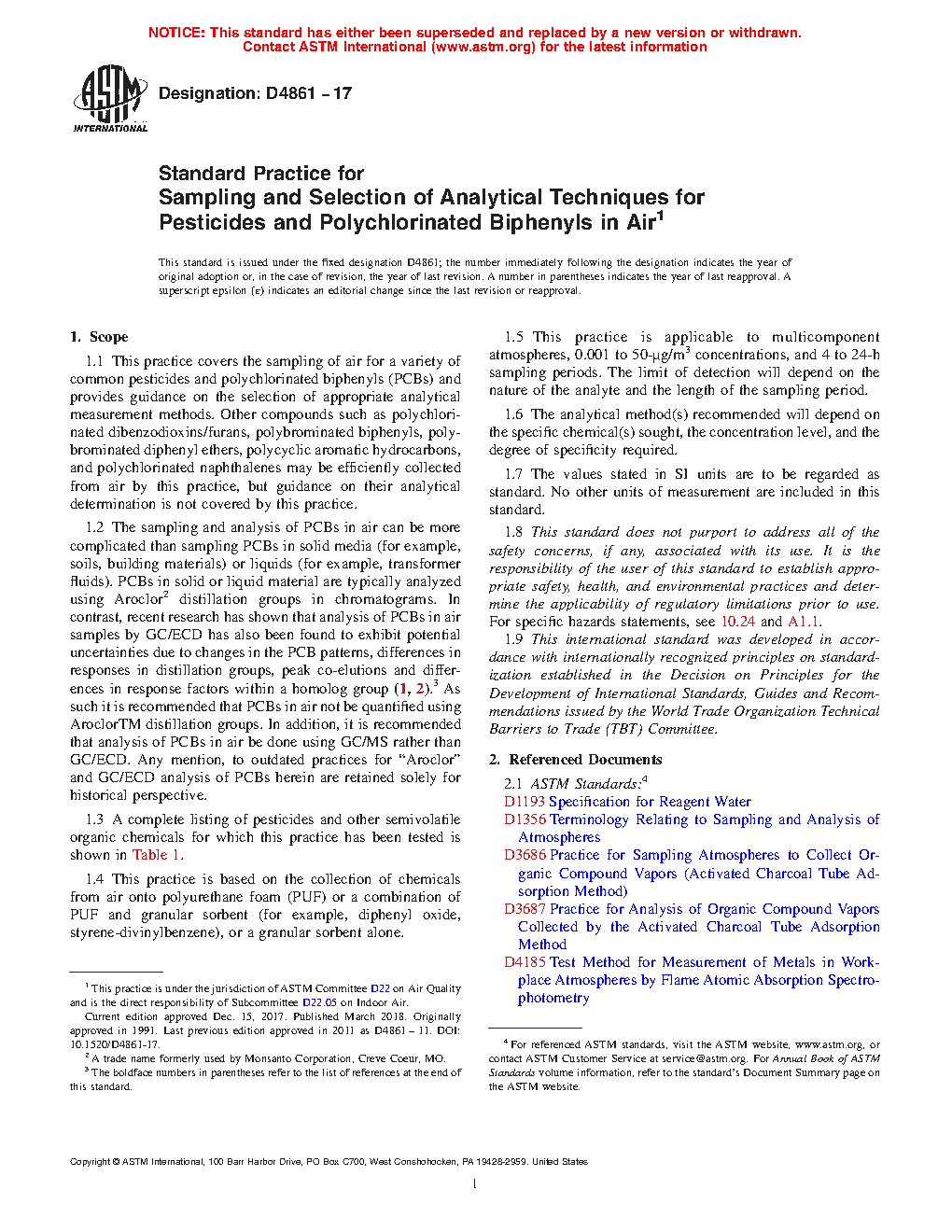 1.1 This practice describes the sampling of atmospheres for a variety of common pesticides and polychlorinated biphenyls (PCBs) and provides guidance on the selection of appropriate analytical measurement methods.