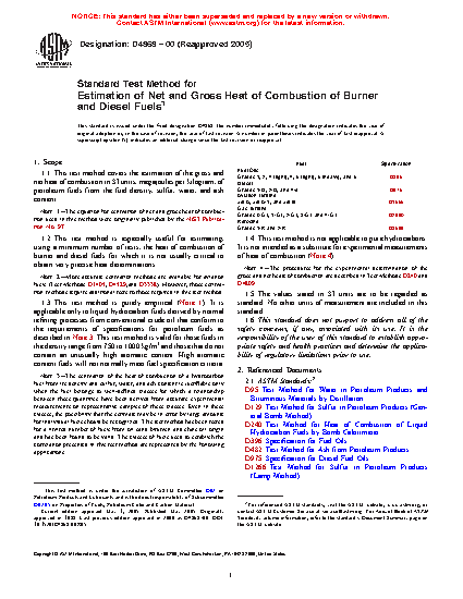 1.1 This test method covers the estimation of the gross and net heat of combustion in SI units, megajoules per kilogram, of petroleum fuels from the fuel density, sulfur, water, and ash content.