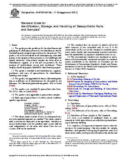 1.1 This guide provides guidelines for the identification and packaging of rolled geosynthetics by the manufacturer and for the handling and storage of geosynthetics by the end user. This guide is not to be considered as all encompassing since each project involving geosynthetics presents its own challenges and special conditions. Geosynthetic samples are often taken at manufacturer, supplier, or at the job site primarily for the purpose of conformance testing and verification. These samples should be properly labeled for identification purposes.
