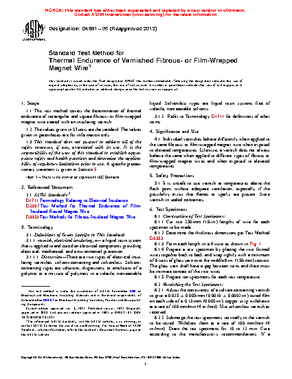 1.1 This test method covers the determination of thermal endurance of rectangular and square fibrous- or film-wrapped magnet wire coated with an insulating varnish.
