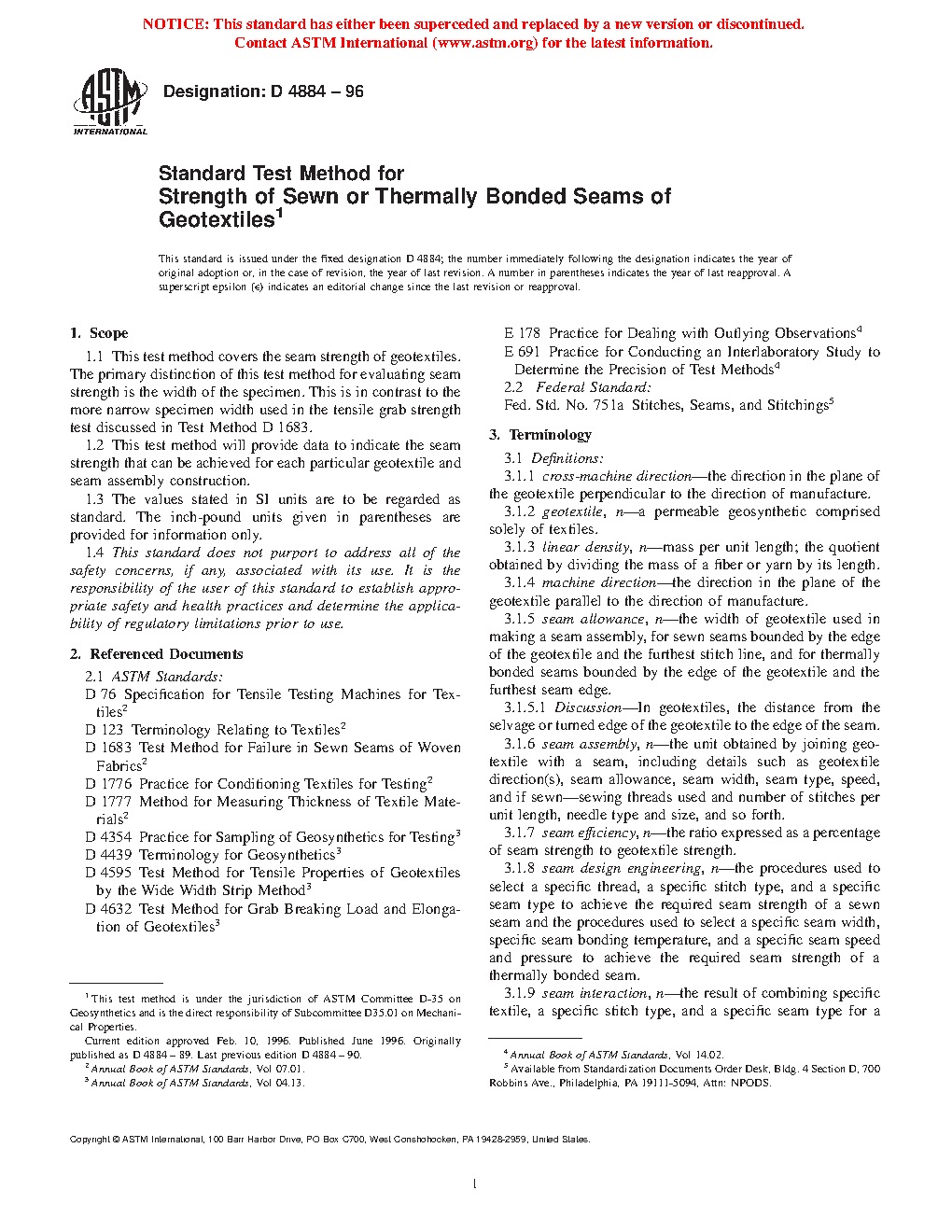 1.1 This test method covers the seam strength of geotextiles. The primary distinction of this test method for evaluating seam strength is the width of the specimen. This is in contrast to the more narrow specimen width used in the tensile grab strength test discussed in Test Method D 1683.