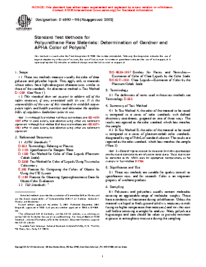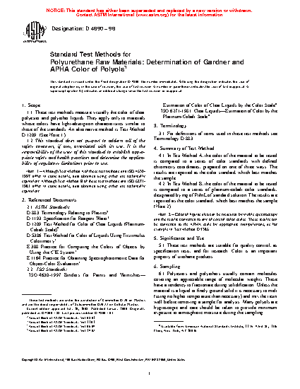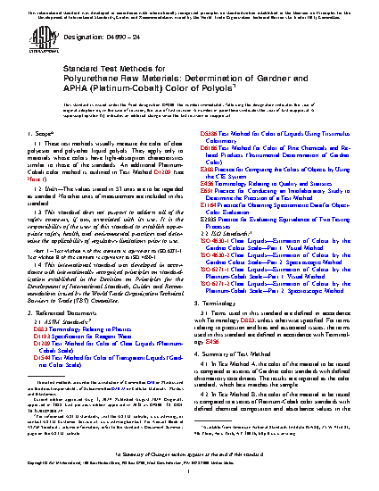 1.1 These test methods measure visually the color of clear polyester and polyether liquids. They apply only to materials whose colors have light-absorption characteristics similar to those of the standards. An alternative method is Test Method D1209. (See Note 1.)