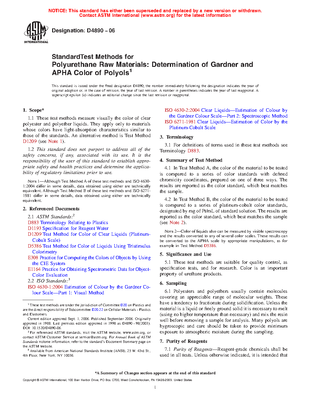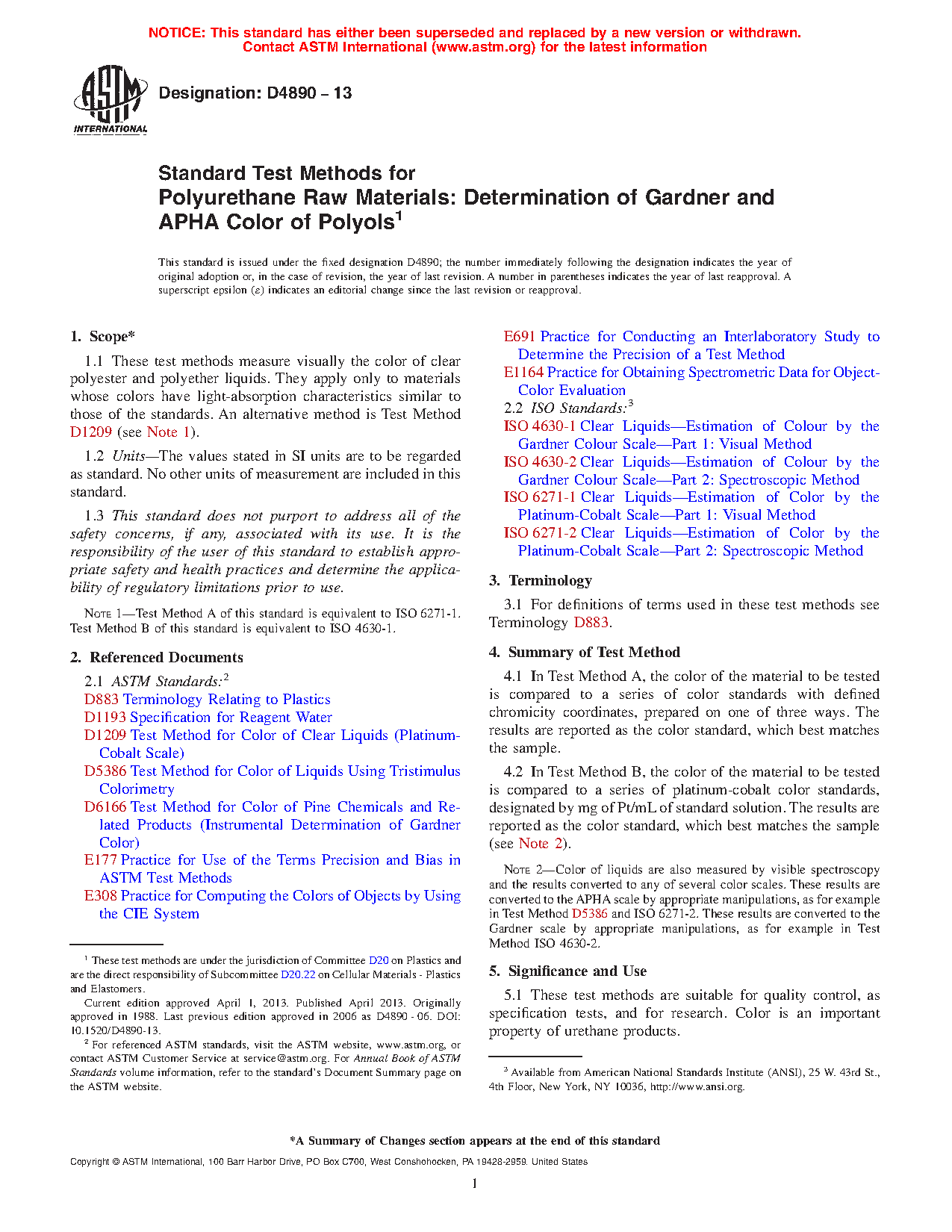 Standard Test Methods for Polyurethane Raw Materials Determination of Gardner and APHA Color of Polyols