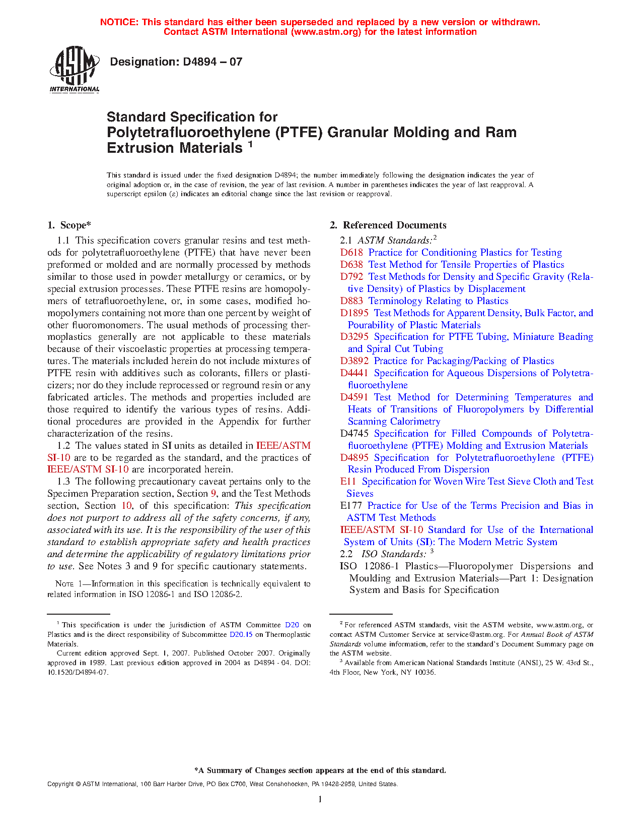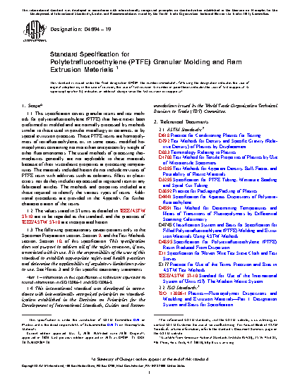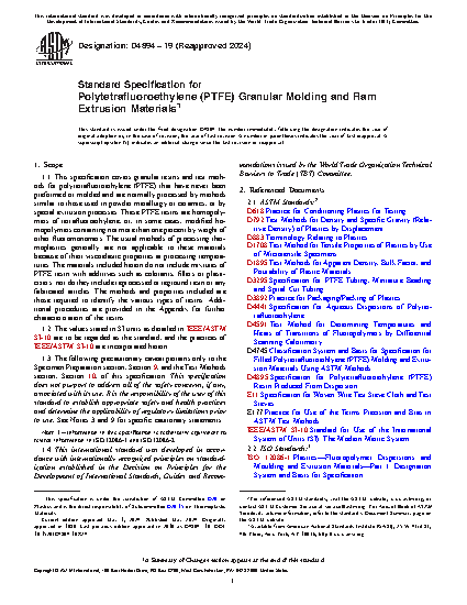 1.1 This specification covers granular resins and test methods for polytetrafluoroethylene (PTFE) that have never been preformed or molded and are normally processed by methods similar to those used in powder metallurgy or ceramics, or by special extrusion processes. These PTFE resins are homopolymers of tetrafluoroethylene, or, in some cases, modified homopolymers containing not more than one percent by weight of other fluoromonomers. The usual methods of processing thermoplastics generally are not applicable to these materials because of their viscoelastic properties at processing temperatures. The materials included herein do not include mixtures of PTFE resin with additives such as colorants, fillers or plasticizers; nor do they include reprocessed or reground resin or any fabricated articles. The methods and properties included are those required to identify the various types of resins. Additional procedures are provided in the Appendix for further characterization of the resins.