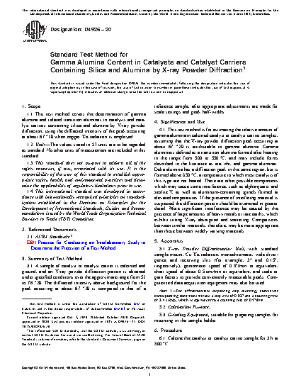 1.1 This test method covers the determination of gamma alumina and related transition aluminas in catalysts and catalyst carriers containing silica and alumina by X-ray powder diffraction, using the diffracted intensity of the peak occurring at about 67 °2? when copper Ka radiation is employed.