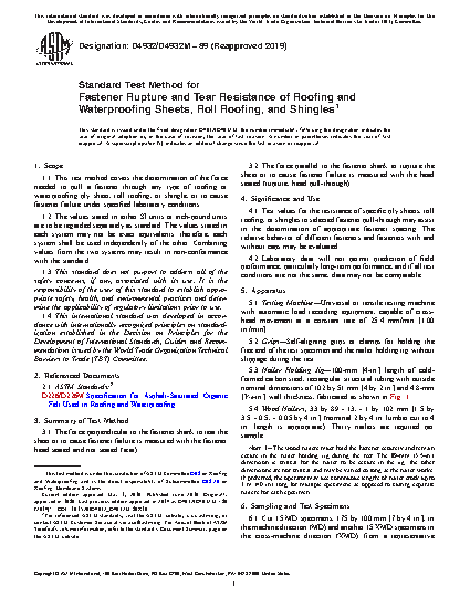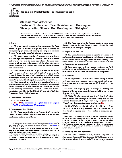 1.1 This test method covers the determination of the force needed to pull a fastener through any type of roofing or waterproofing ply sheet, roll roofing, or shingle, or to cause fastener failure under specified laboratory conditions.