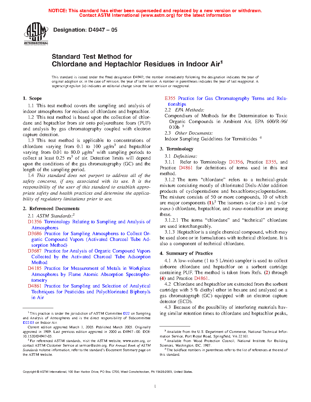 1.1 This test method covers the sampling and analysis of indoor atmospheres for residues of chlordane and heptachlor.