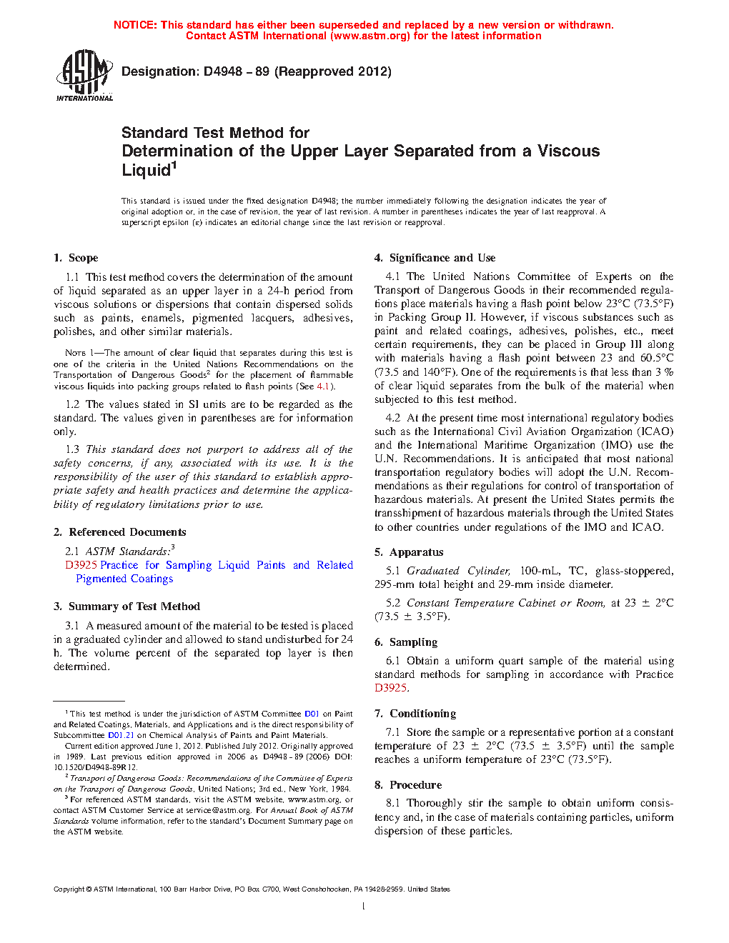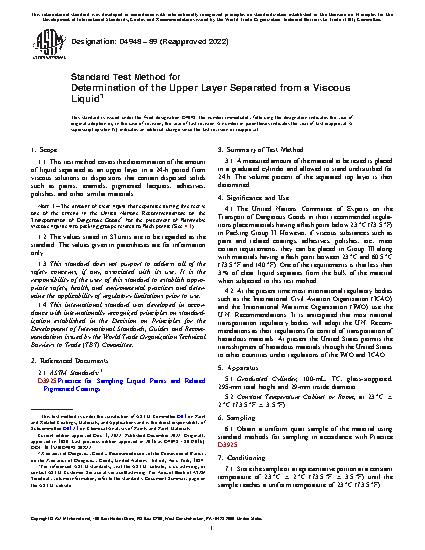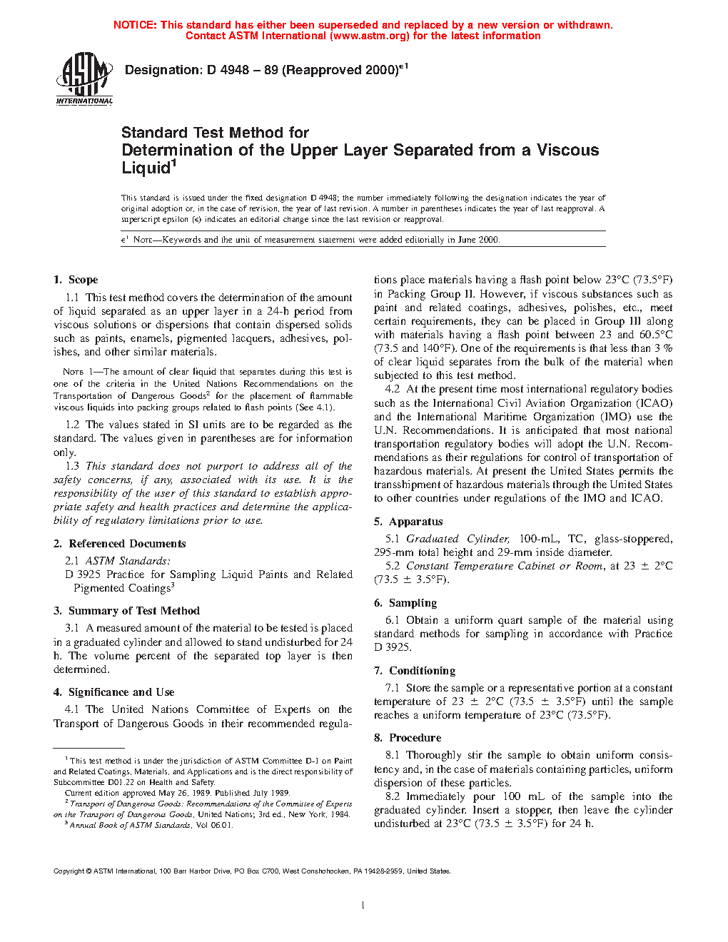 The United Nations Committee of Experts on the Transport of Dangerous Goods in their recommended regulations place materials having a flash point below 23°C (73.5°F) in Packing Group II. However, if viscous substances such as paint and related coatings, adhesives, polishes, etc., meet certain requirements, they can be placed in Group III along with materials having a flash point between 23 and 60.5°C (73.5 and 140°F). One of the requirements is that less than 3 % of clear liquid separates from the bulk of the material when subjected to this test method.