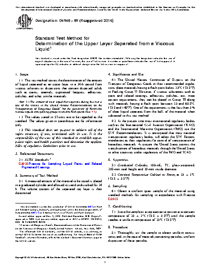 1.1 This test method covers the determination of the amount of liquid separated as an upper layer in a 24-h period from viscous solutions or dispersions that contain dispersed solids such as paints, enamels, pigmented lacquers, adhesives, polishes, and other similar materials.