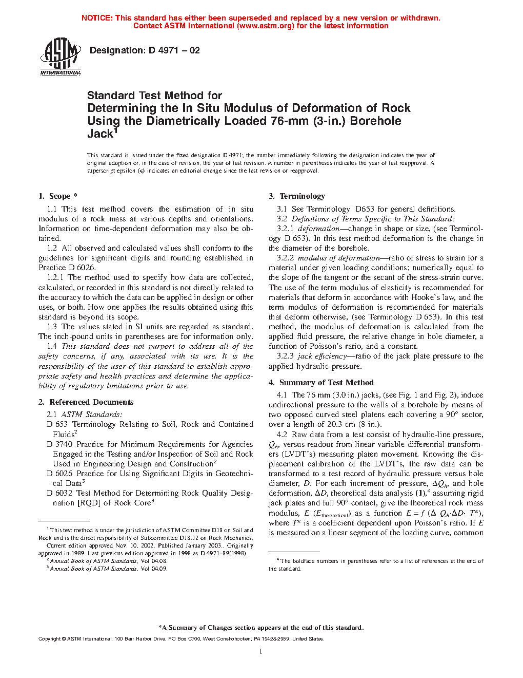 1.2 This test method covers testing in an N size drill hole and is more relevant to a borehole jack device designed for “hard rock” than for soft rock.
