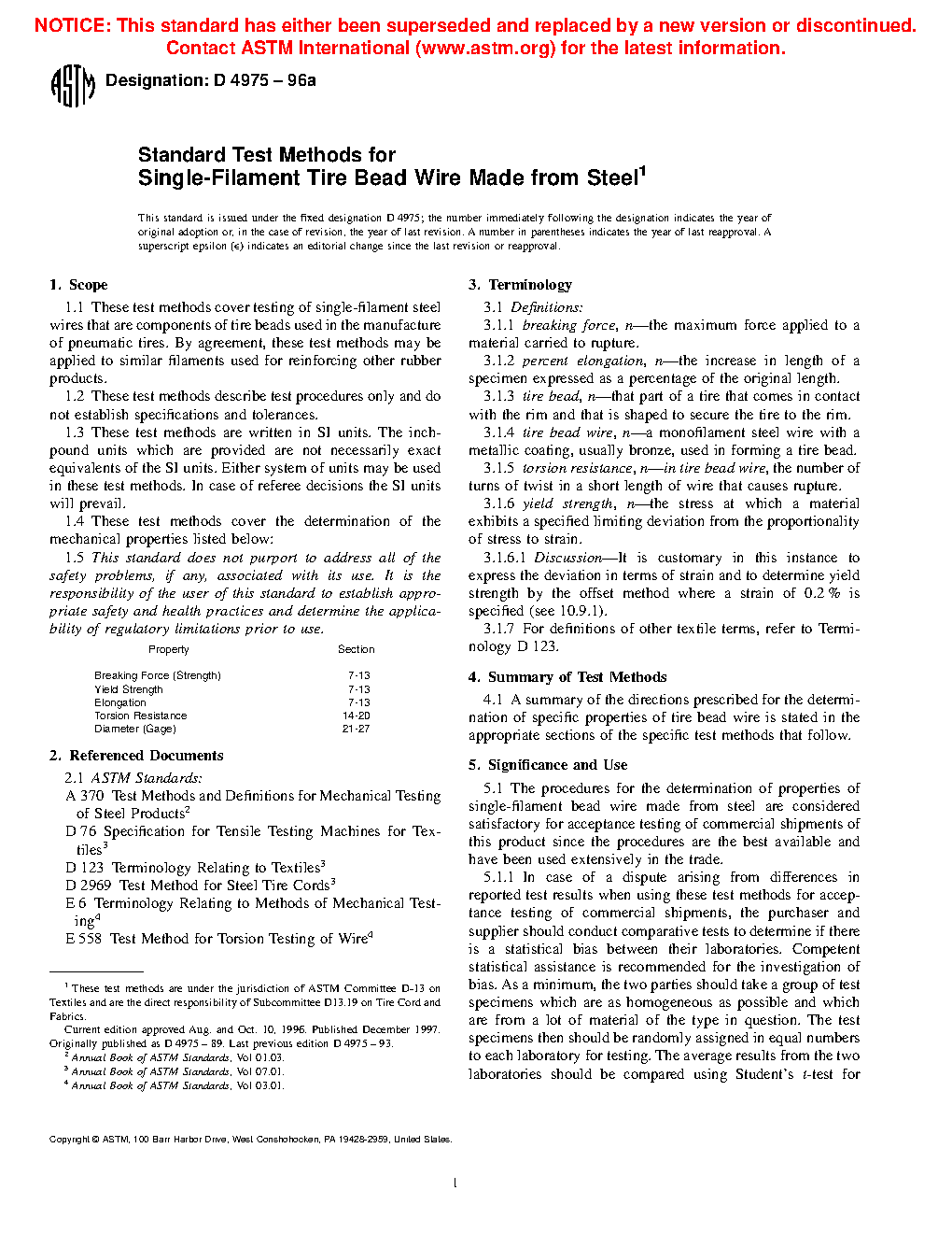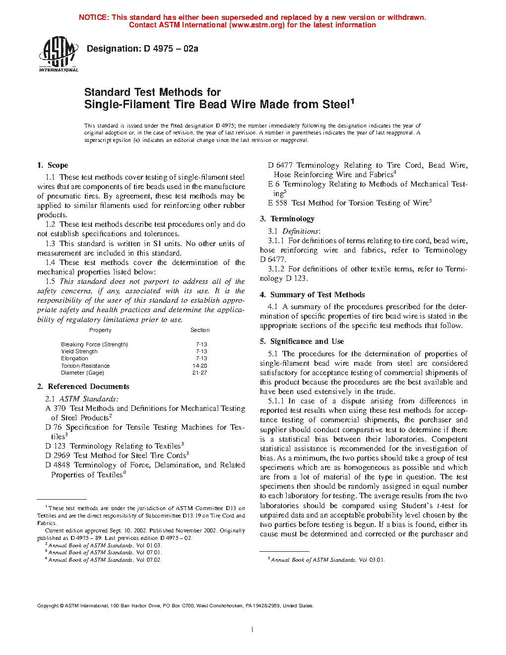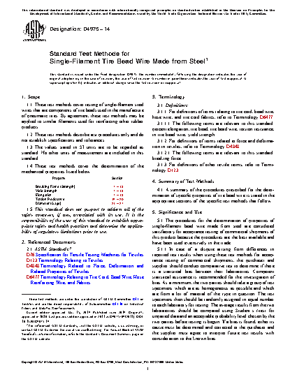 1.1 These test methods cover testing of single-filament steel wires that are components of tire beads used in the manufacture of pneumatic tires. By agreement, these test methods may be applied to similar filaments used for reinforcing other rubber products.